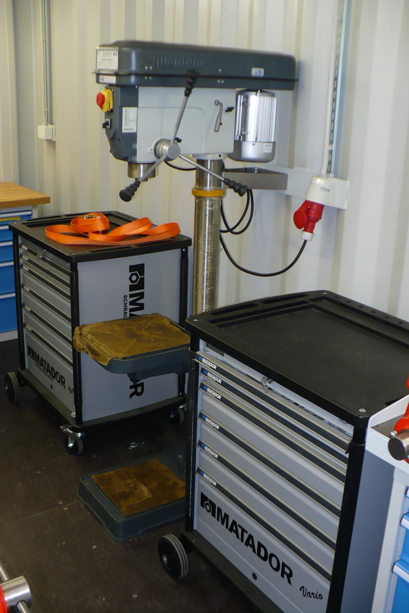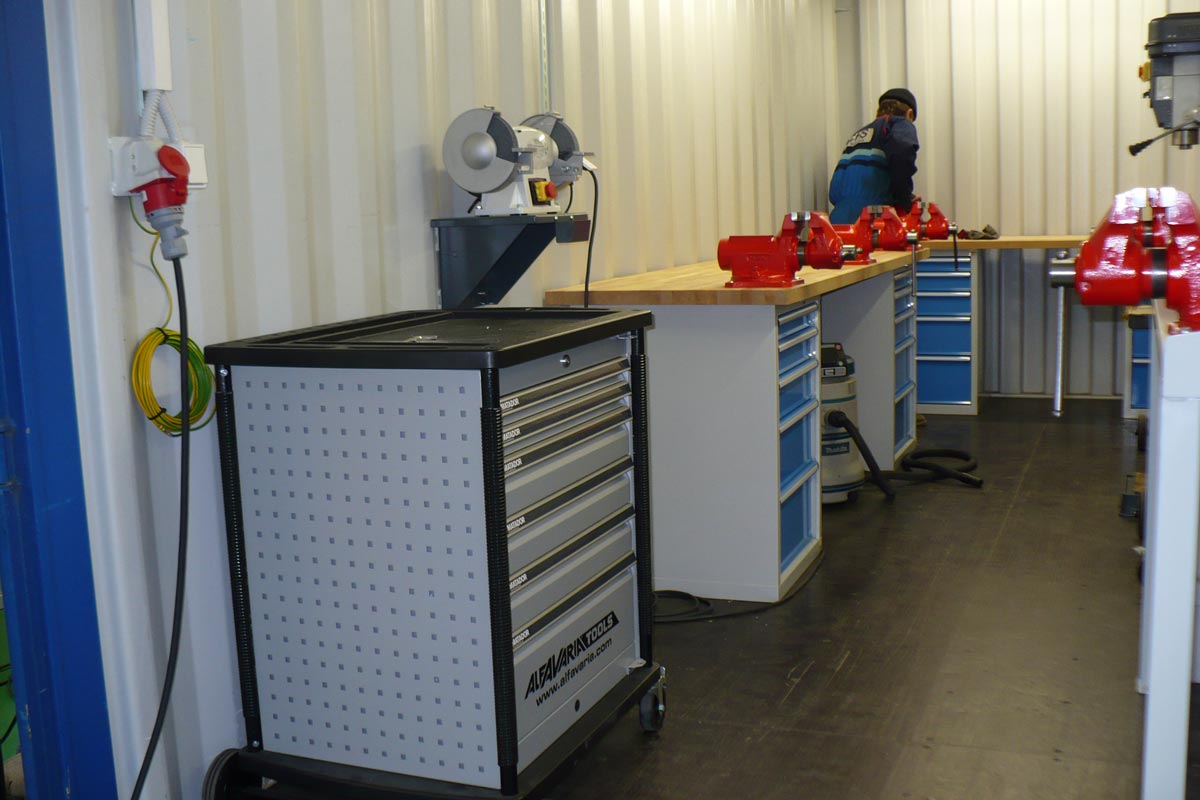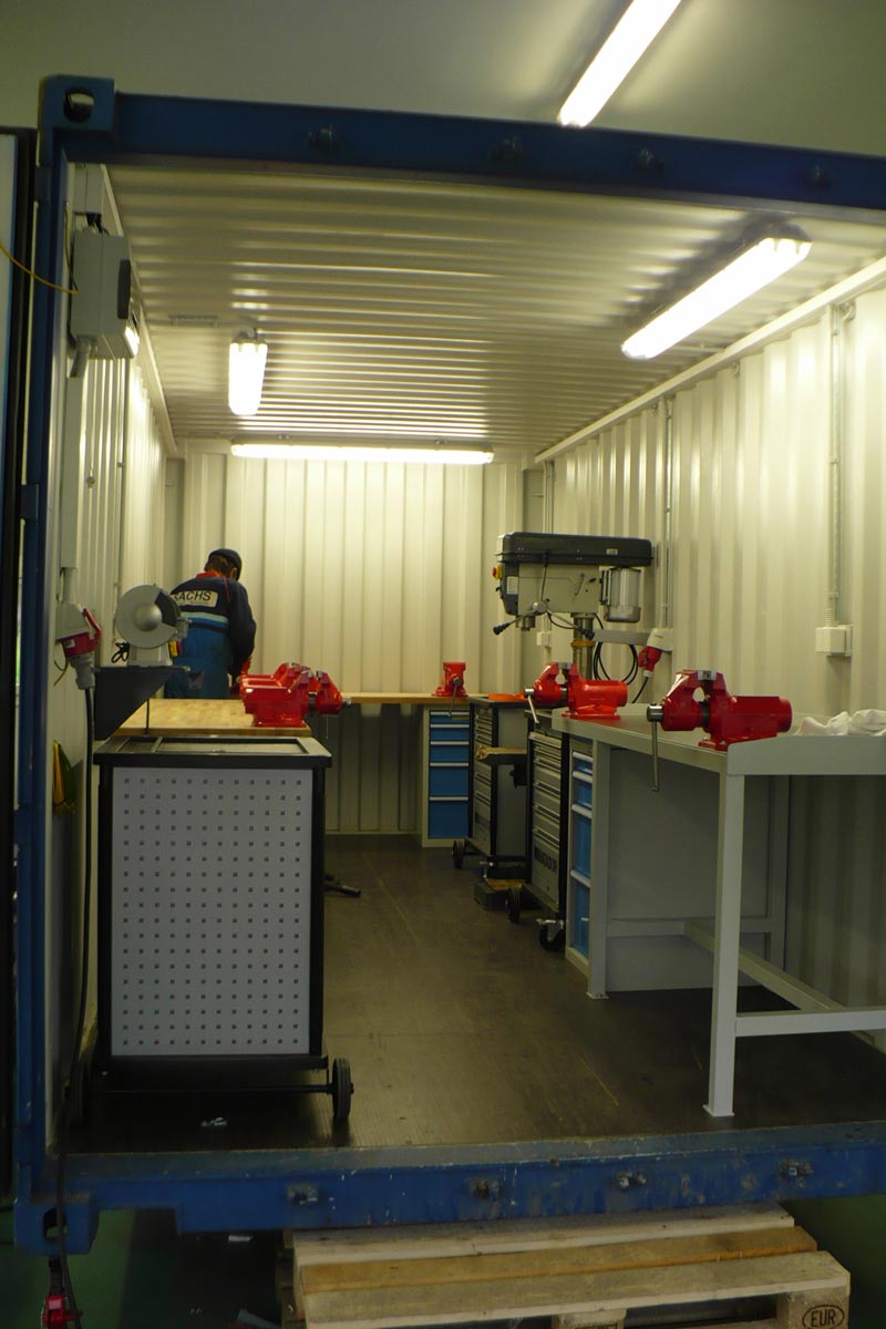 Školící kontejnerová dílna vestavěná do 20“ kontejneru uzpůsobeného pro práci 7 studentů / mechaniků. Kompletní dodávka pojízdné dílny určené pro výcvikové účely v africké Angole. Projekt zahrnoval dodávku přepravního kontejneru, návrh uspořádání vnitřního vybavení včetně dodávky dílenského nábytku, strojů a nářadí.