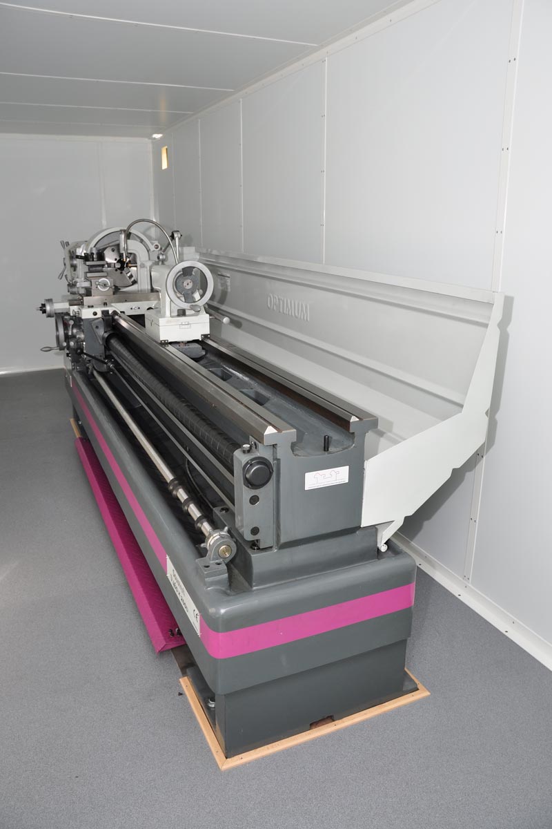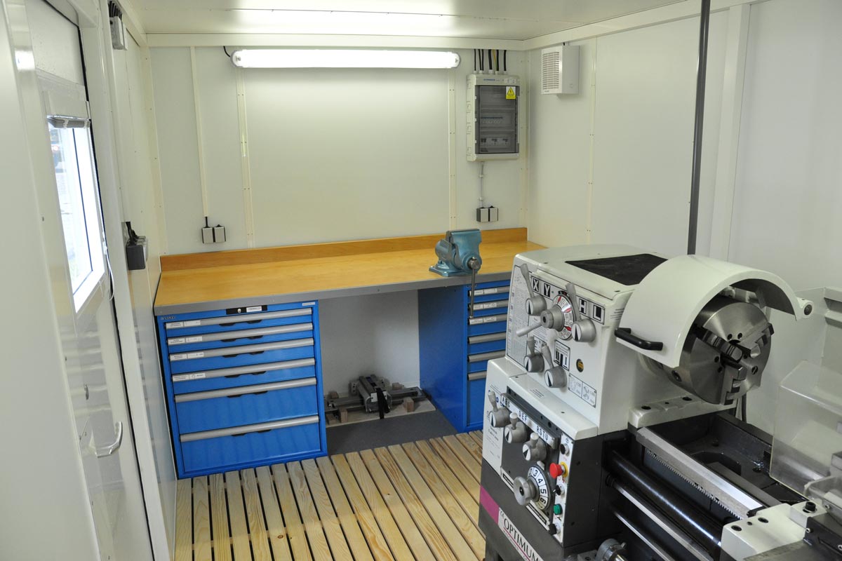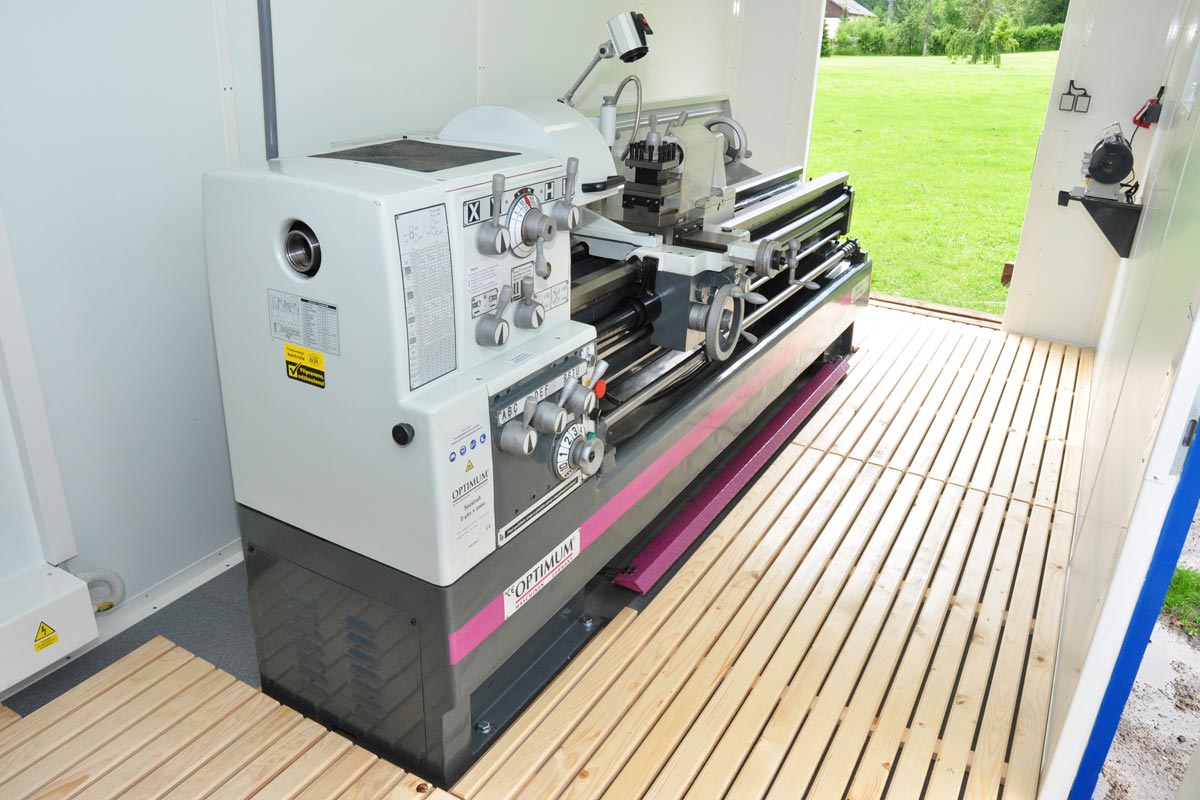 Plně funkční, soběstačná soustružnická dílna vestavěná do 20“ přepravního kontejneru. Upravili jsme kontejner o speciální podlahu, přídavná okna, boční dveře, izolace, topení a klimatizace, elektroinstalace.