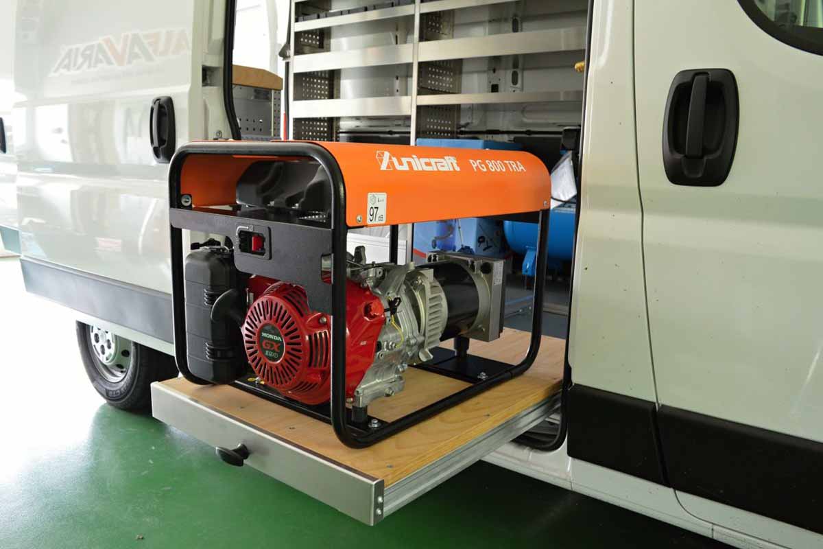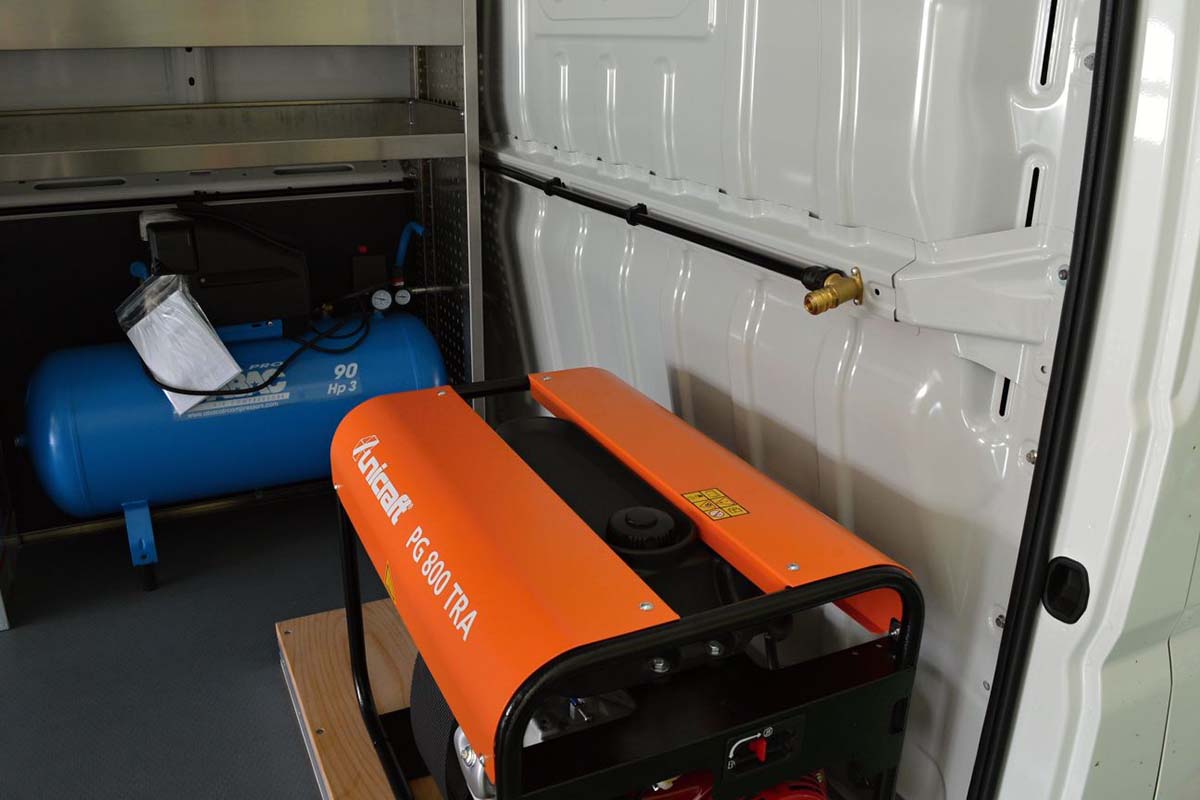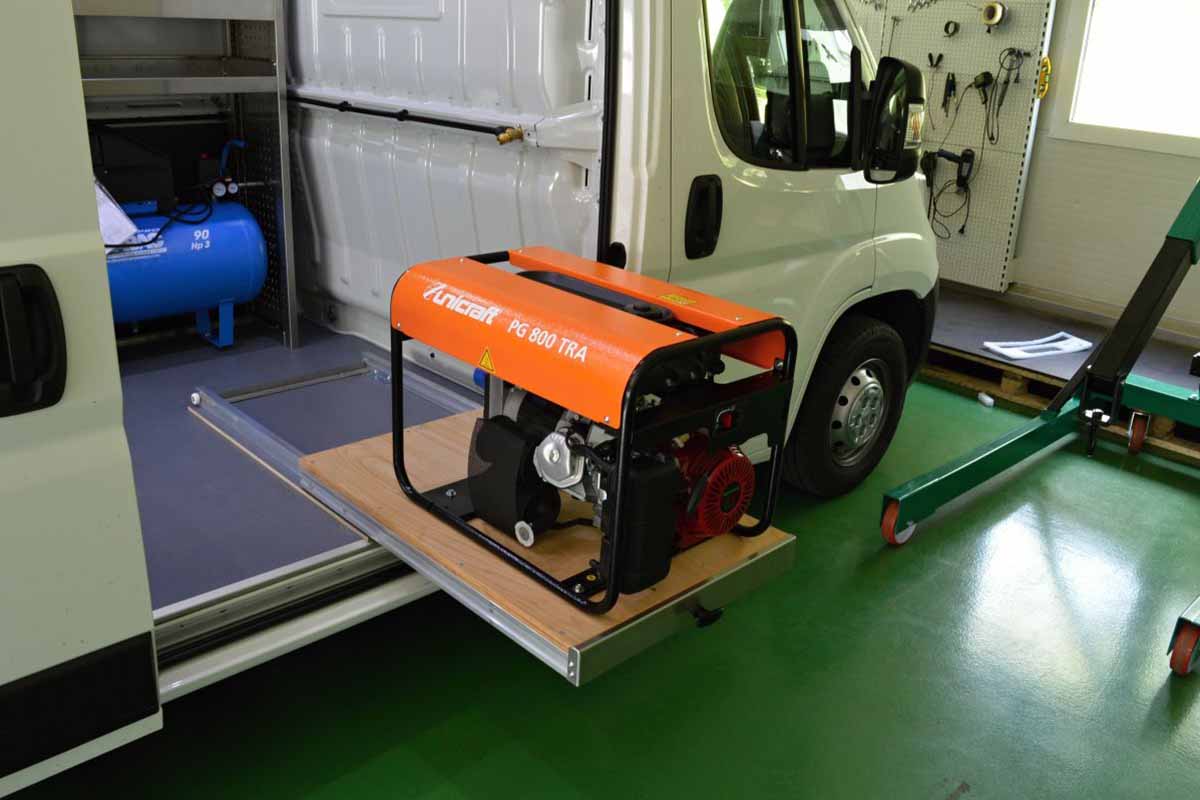 Vestavba do dodávky Citroen Jumper, s kompresorem, elektrocentrálou, na výsuvné plošině. Citroen Jumper slouží jako výjezdové servisní vozidlo. Součástí vestavby jsou boční regálové police v obou bocích vozu, zčásti se zásuvkami. Kompresorová stanice (realizovali jsme rozvod stlačeného vzduchu ve vozidle). Zajímavostí je výsuvná plošina v bočních dveřích, na kterou jsme umístili elektrocentrálu. Interiér nákladového prostoru jsme osadili ledkovým osvětlením.