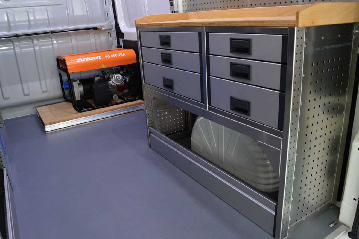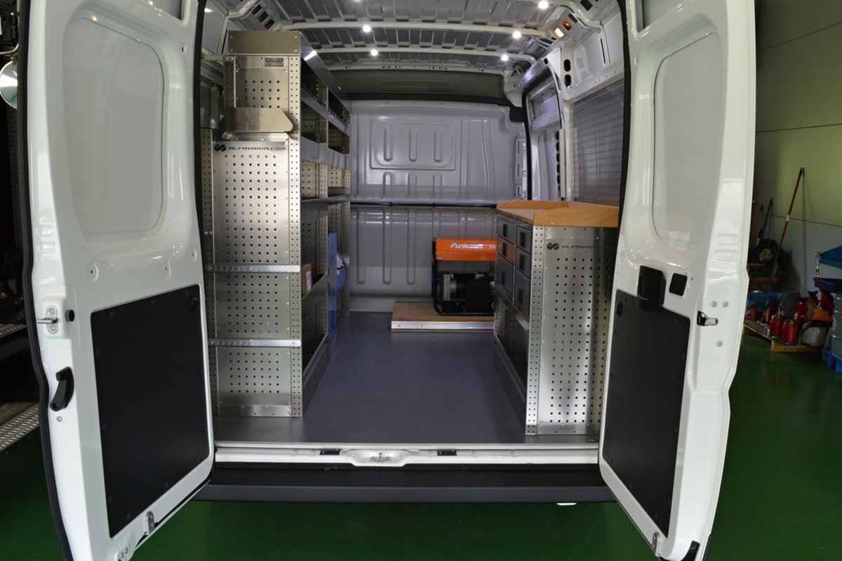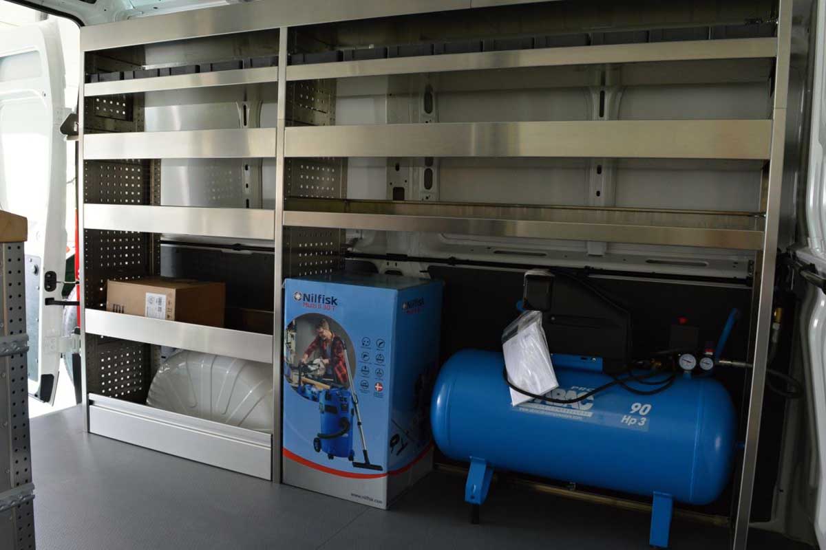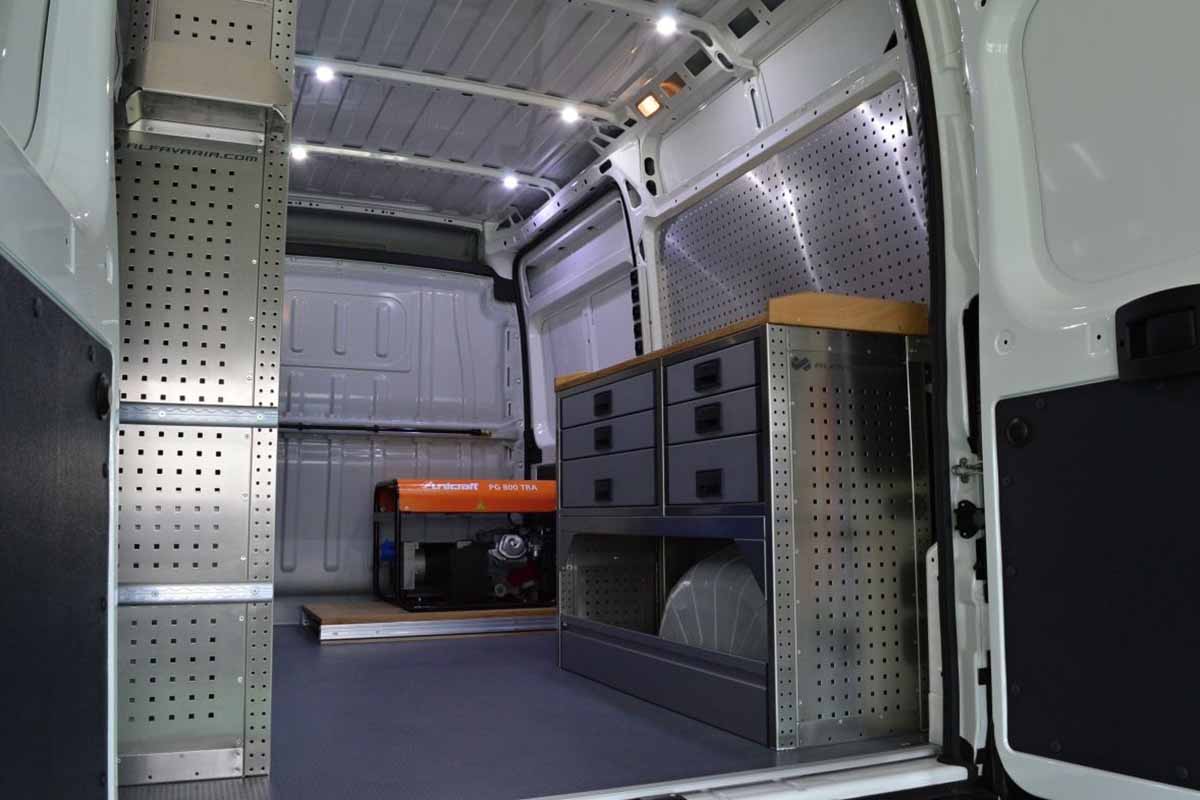 Vestavba do dodávky Citroen Jumper, s kompresorem, elektrocentrálou, na výsuvné plošině. Citroen Jumper slouží jako výjezdové servisní vozidlo. Součástí vestavby jsou boční regálové police v obou bocích vozu, zčásti se zásuvkami. Kompresorová stanice (realizovali jsme rozvod stlačeného vzduchu ve vozidle). Zajímavostí je výsuvná plošina v bočních dveřích, na kterou jsme umístili elektrocentrálu. Interiér nákladového prostoru jsme osadili ledkovým osvětlením.