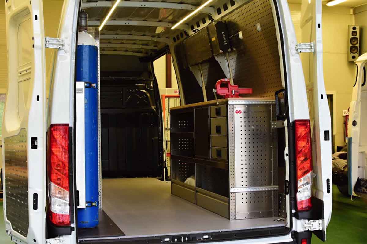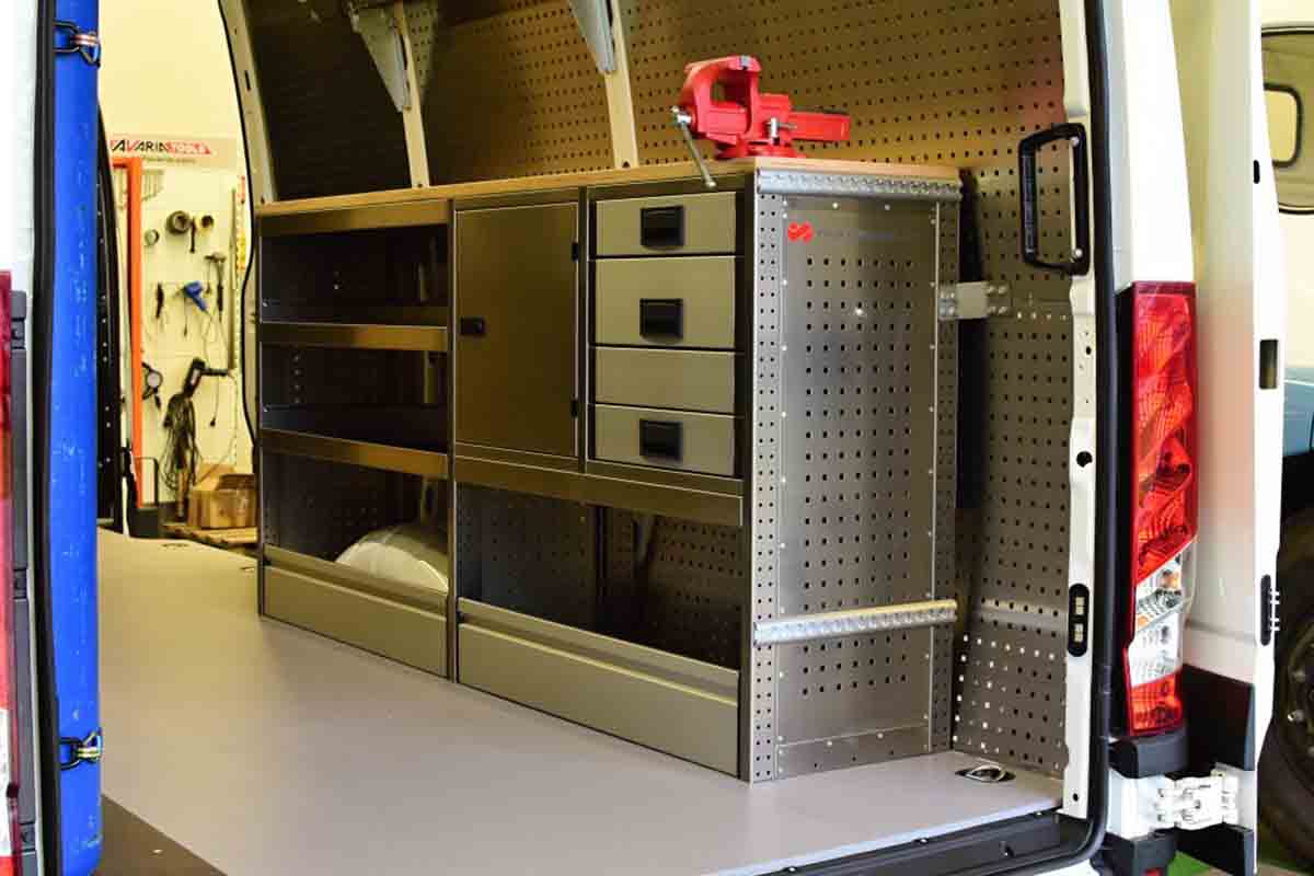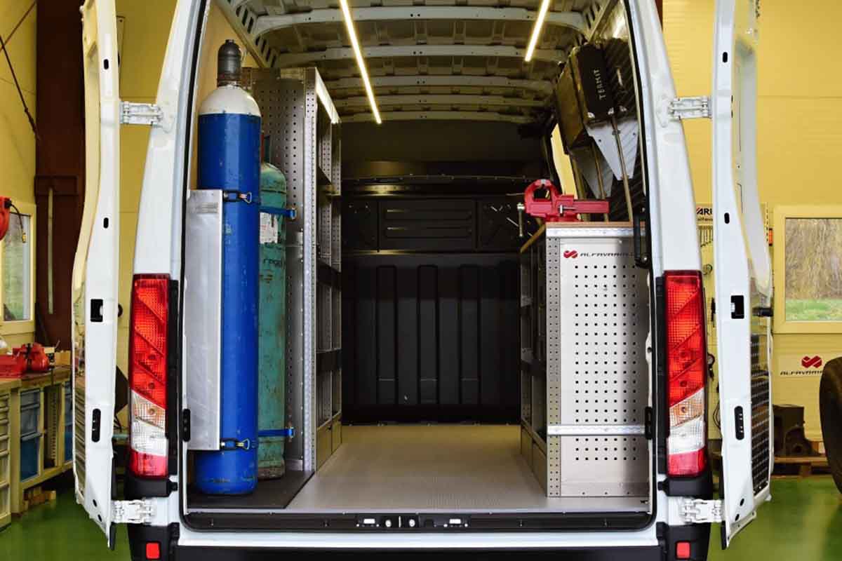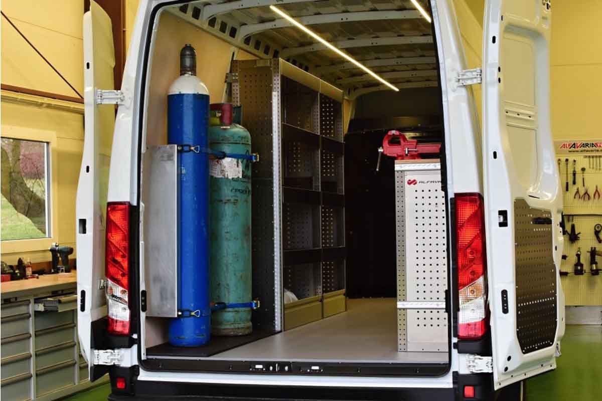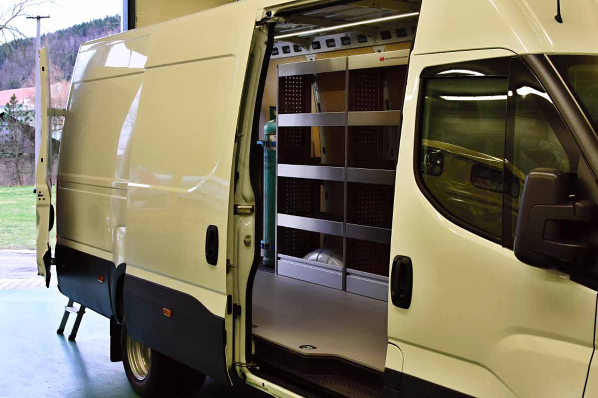 Auto vestavba realizovaná do dodávky Iveco. Zákazník je stavební firma, která vozidlo používá jako pojízdnou servisní dílnu pro opravy stavebních strojů. Lehké hliníkové regály do auta, podlaha. Držák technických plynů. Držák na kufr se samonivelační latí. V pravé straně na regálovém ponku dřevěná deska se svěrákem. Do dodávky jsme instalovali osvětlení.