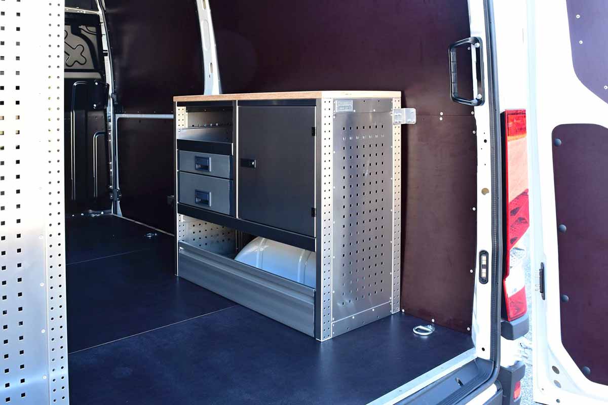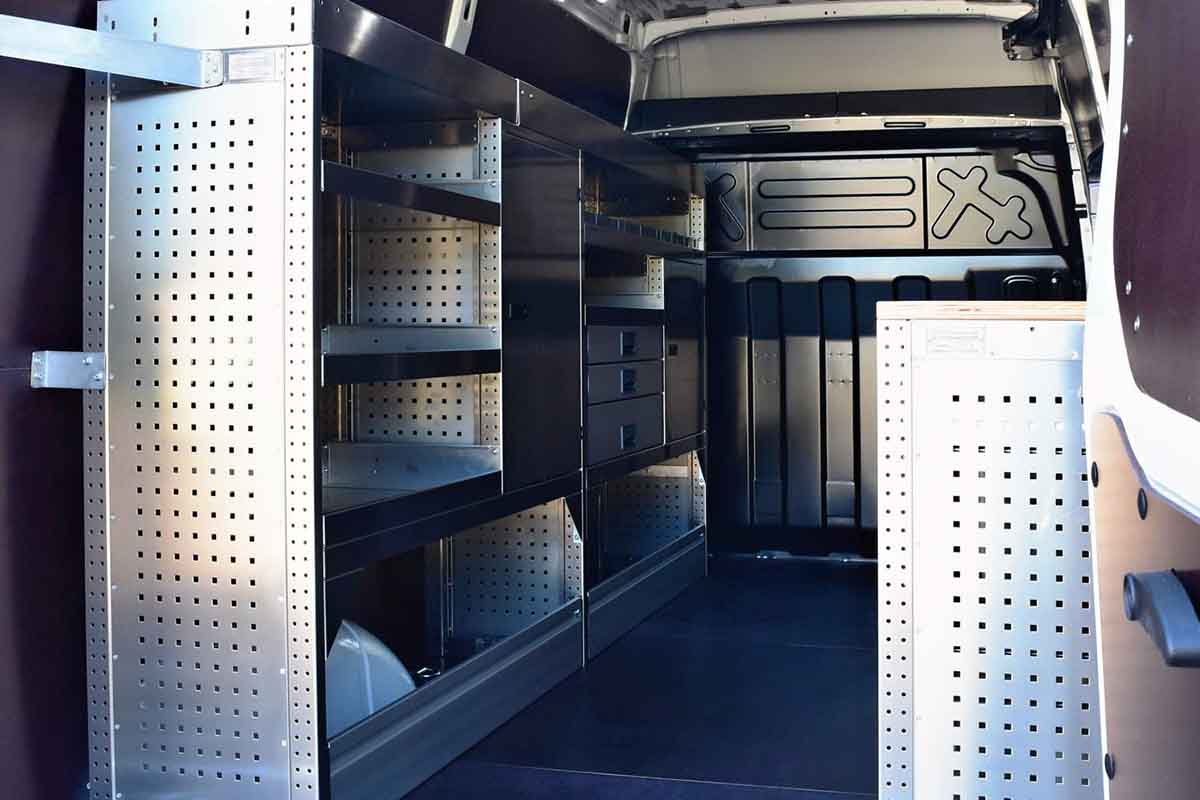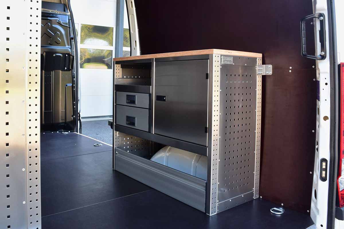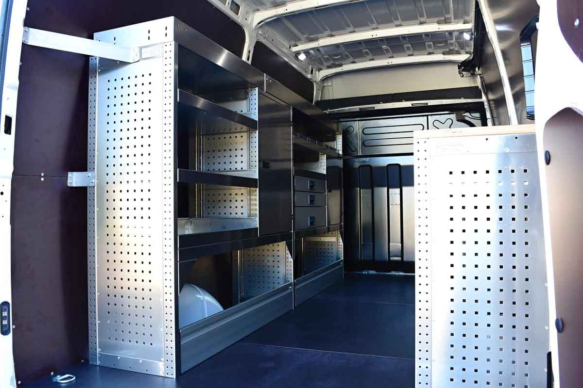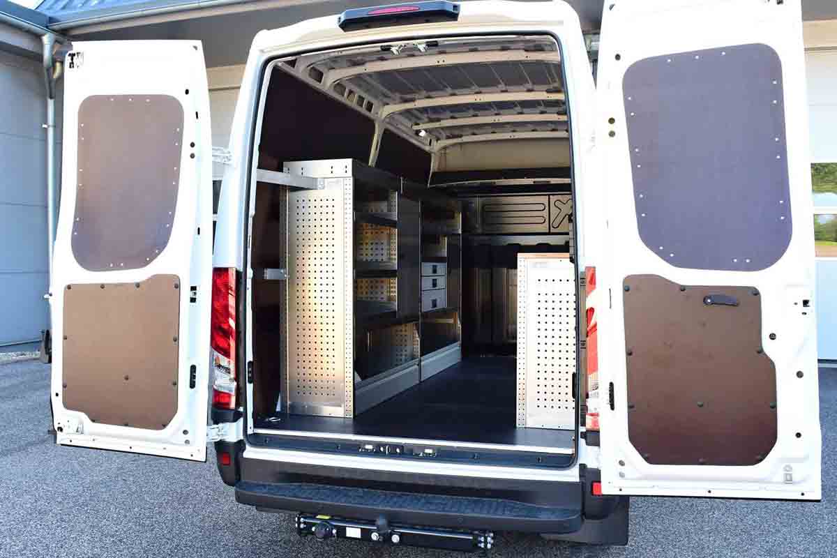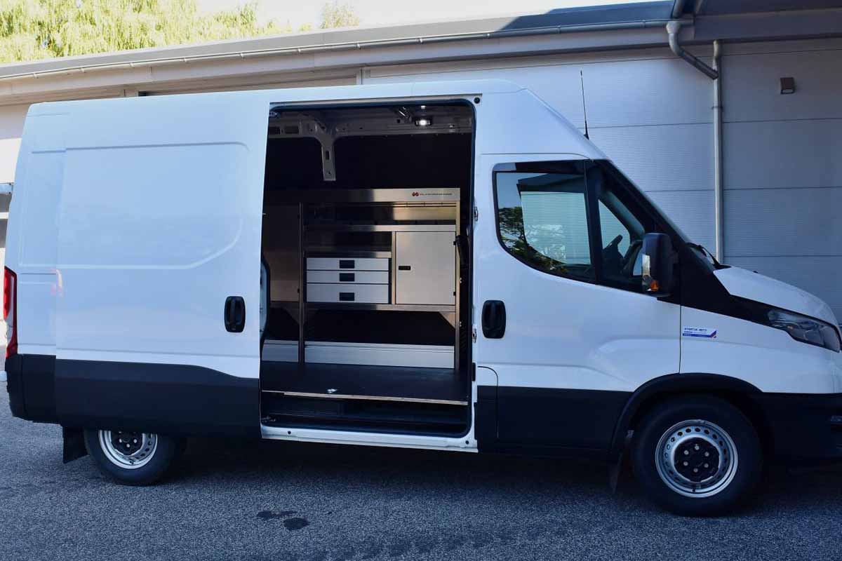 Hliníková vestavba na míru do dodávky Iveco Daily. Levá strana regál s odkládacími policemi a výsuvnými zásuvkami. V pravé straně auta jednoduchý nízký regál s dvířky a dvěma zásuvkami, krycí dřevěná deska sloužící jako pracovní deska. Ať vestavba dobře a dlouho slouží! 🙂