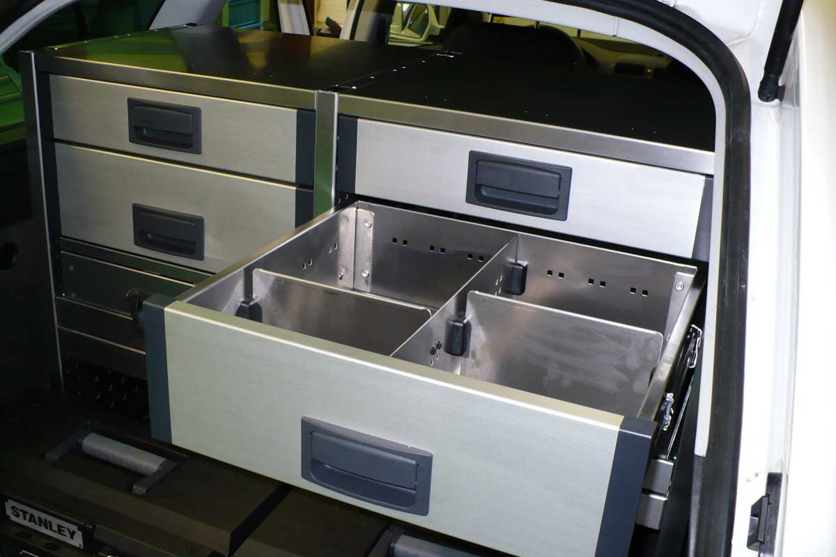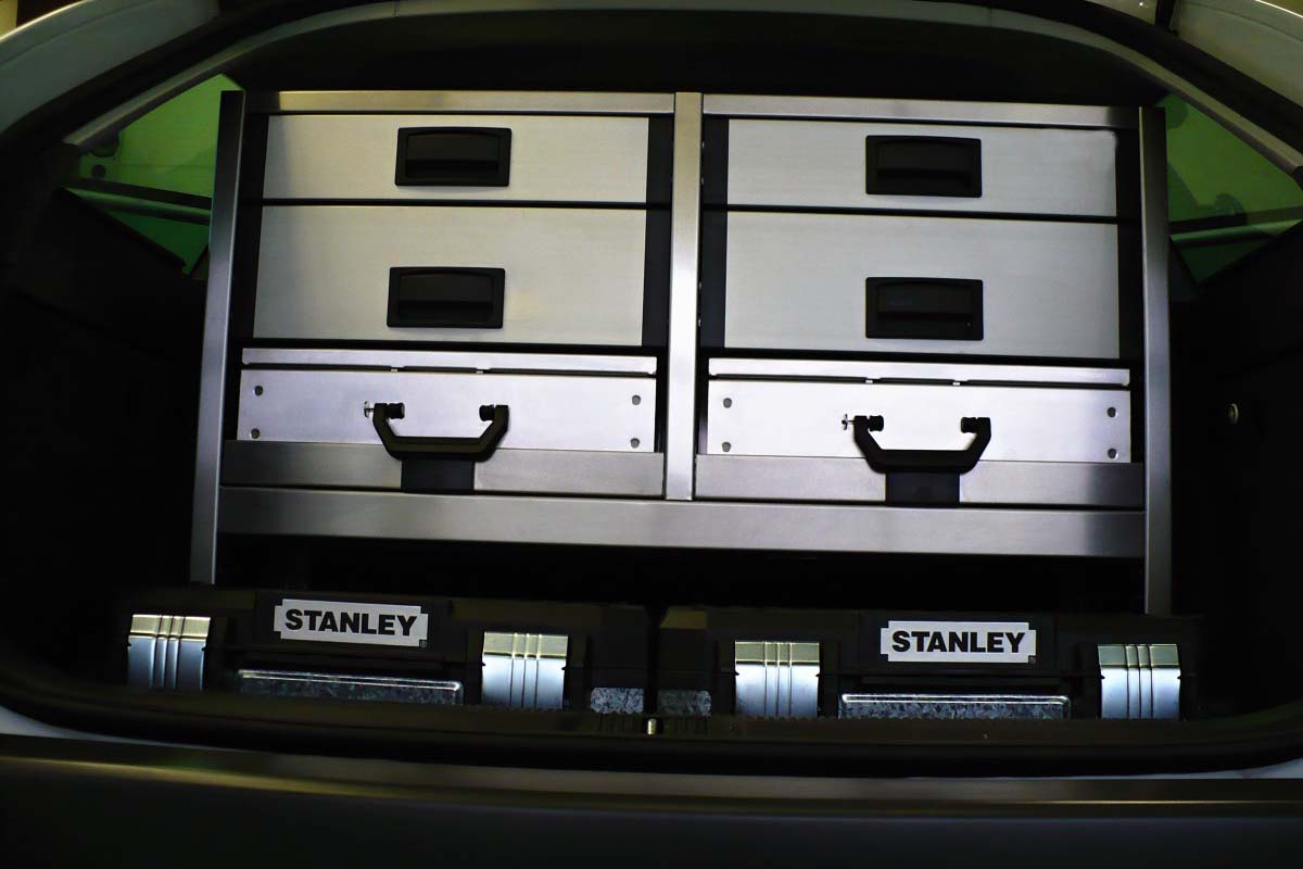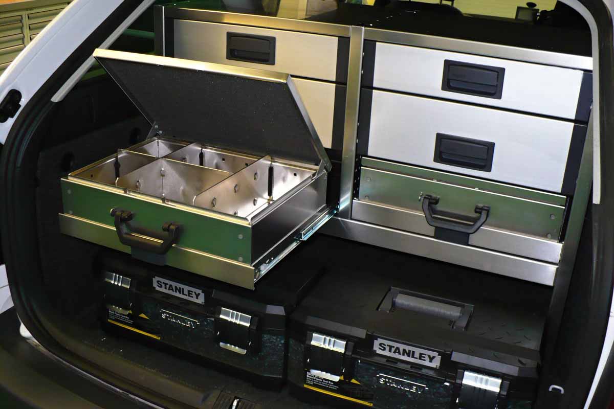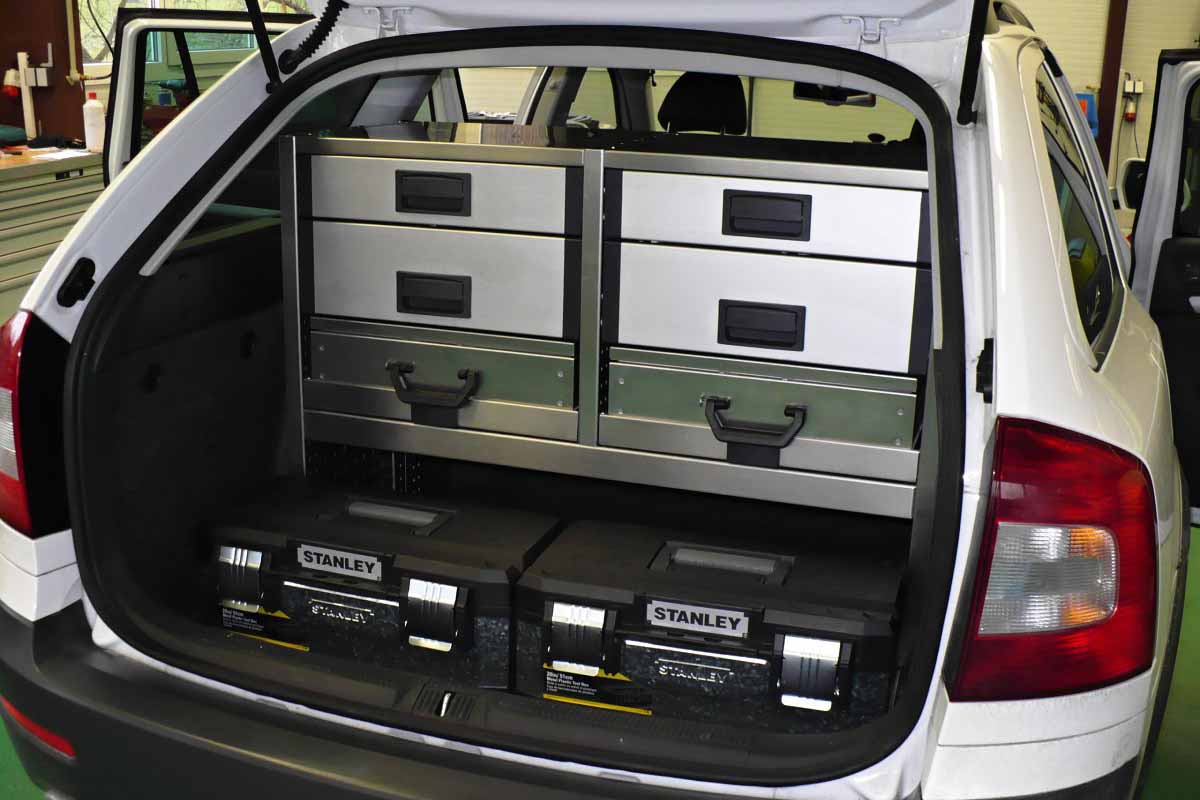 Vestavby děláme nejenom do dodávek, i do malého auta se dá vhodně navrhnout regál se skříňkami a výsuvnými zásuvkami. Výhodou tohoto typu vestavby je prostor pod regálem, kde jsou umístěné dva vyjímatelné boxy na nářadí. Koncept je řešený tak, aby byl v případě potřeby zajištěný přístup k rezervnímu kolu. V horní části v 2×2 zásuvky, plus spodní zásuvky na výsuvné plošině.