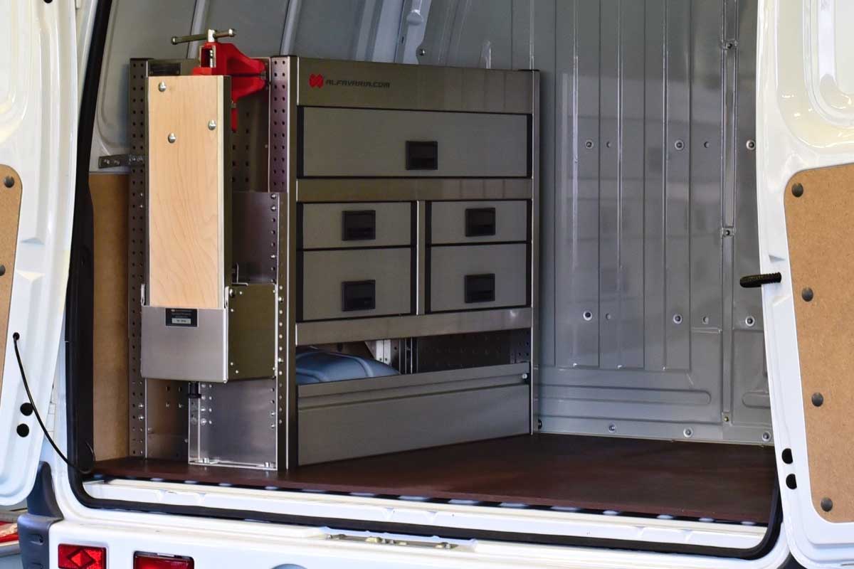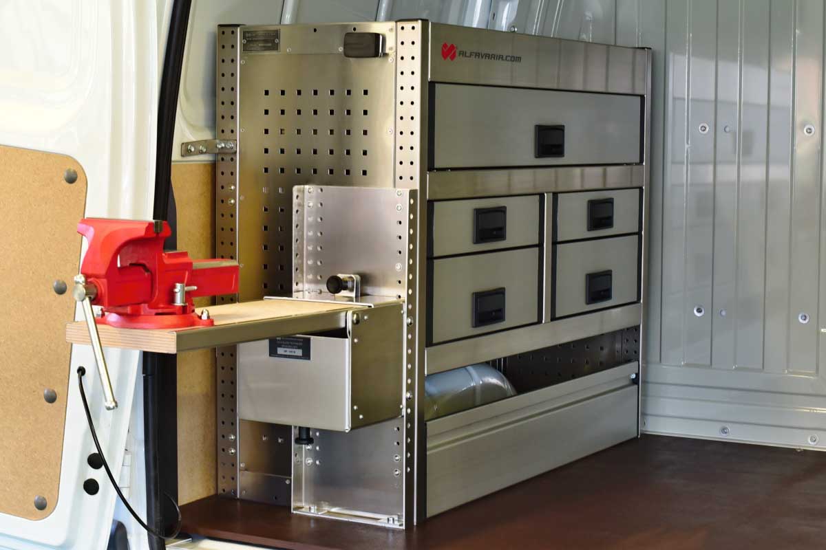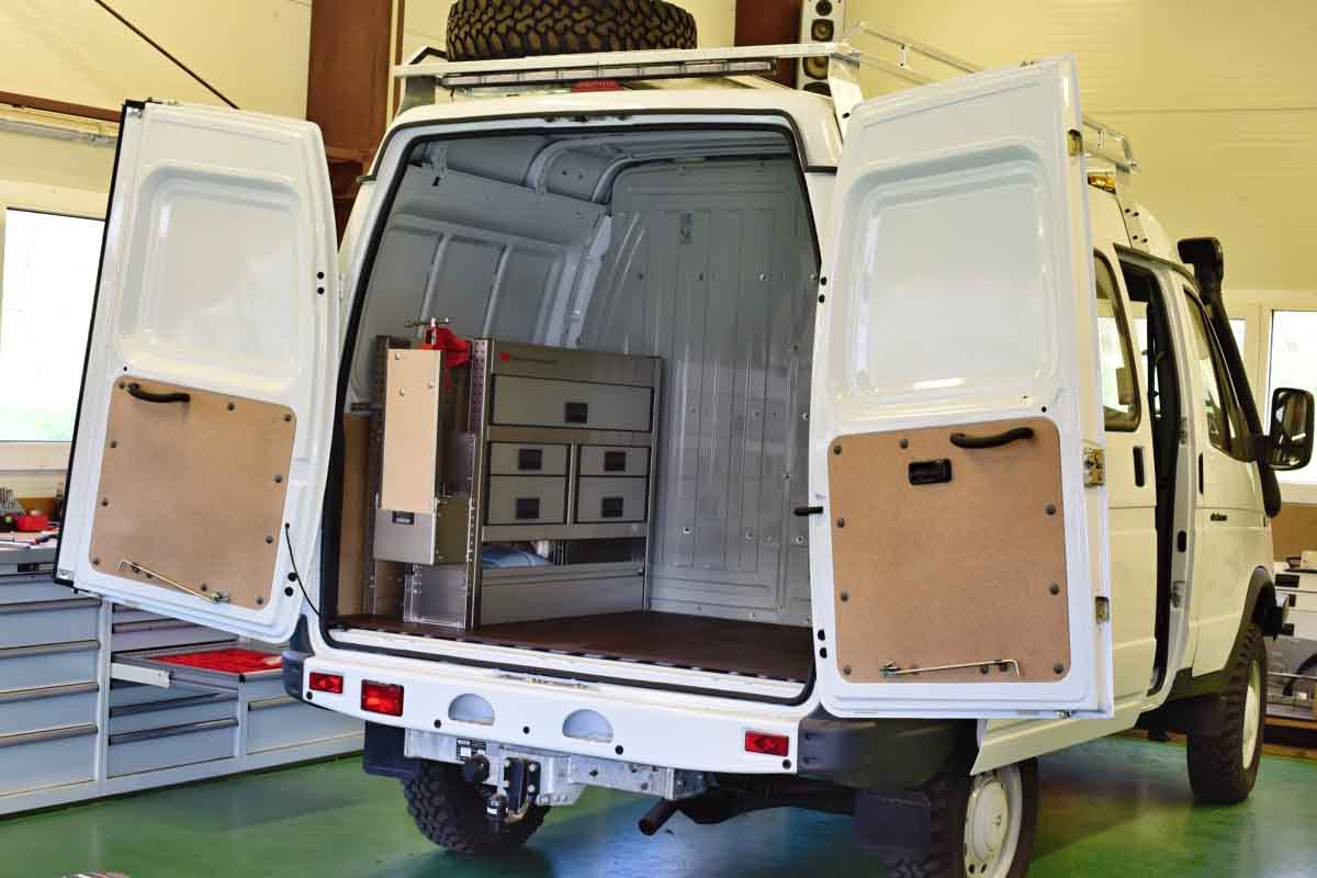 Představujeme jednoduchou vestavbu do vozu GAZ pro zákazníka, který se pohybuje v náročném lesním terénu. Vestavbu tvoří jednoduchý boční regál s uzamykatelnými zásuvkami a dalším úložným prostorem. Na bok skříně jsme namontovali sklopný svěrák.