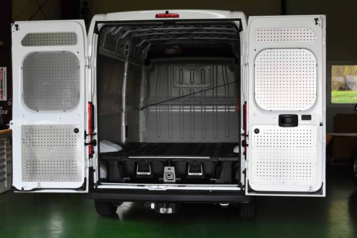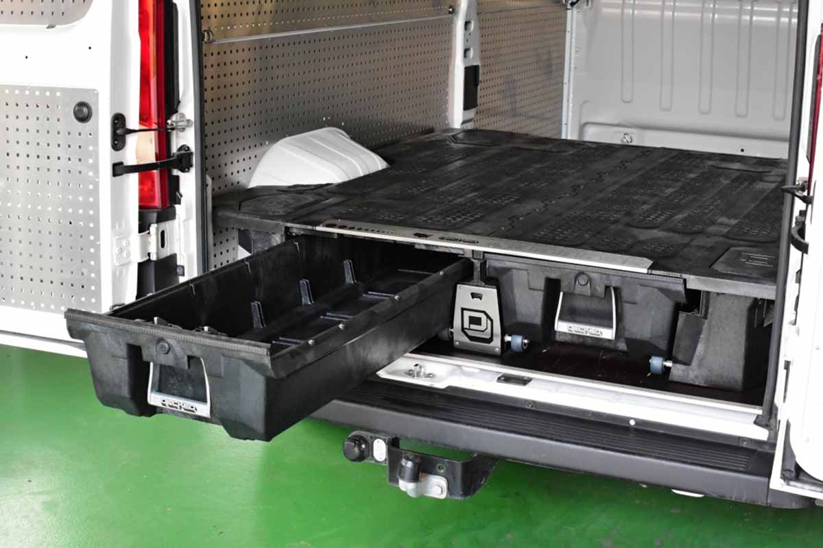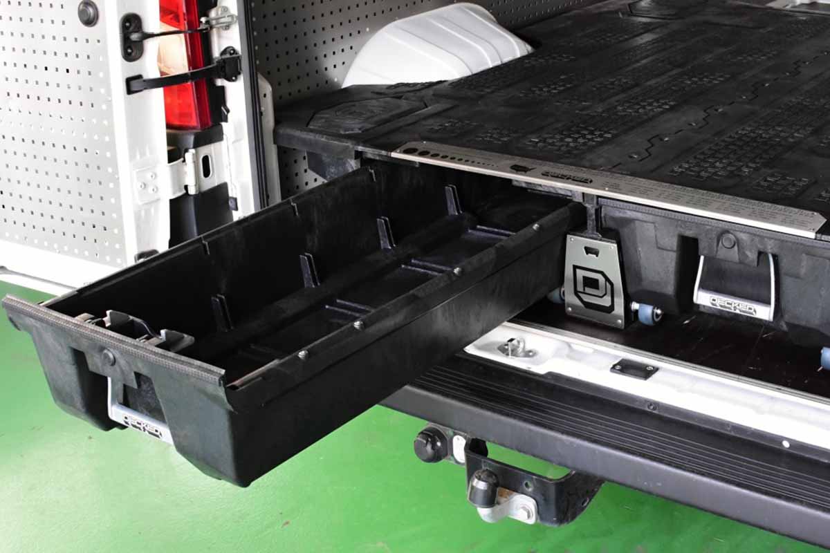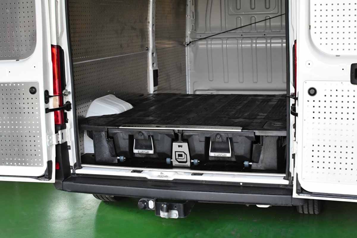 Řešení vestavby v podobě zvýšené podlahy v dodávce Peugeot Boxer. V podlaze jsou umístěné 2 výsuvné boxy, do kterých se ukládá výbava a další materiál, který je potřeba k výkonu práce. Nosnost krycí desky až 900 kg (rovnoměrné zatížení). Zakázka včetně montáže, za půl dne hotovo, perfektní poměr cena vs. výkon. Výsuvy Decked jsou určené jak do dodávek jako zvýšená podlaha, tak pro vozy typu pick-up. Čtěte více o výsuvech Decked.