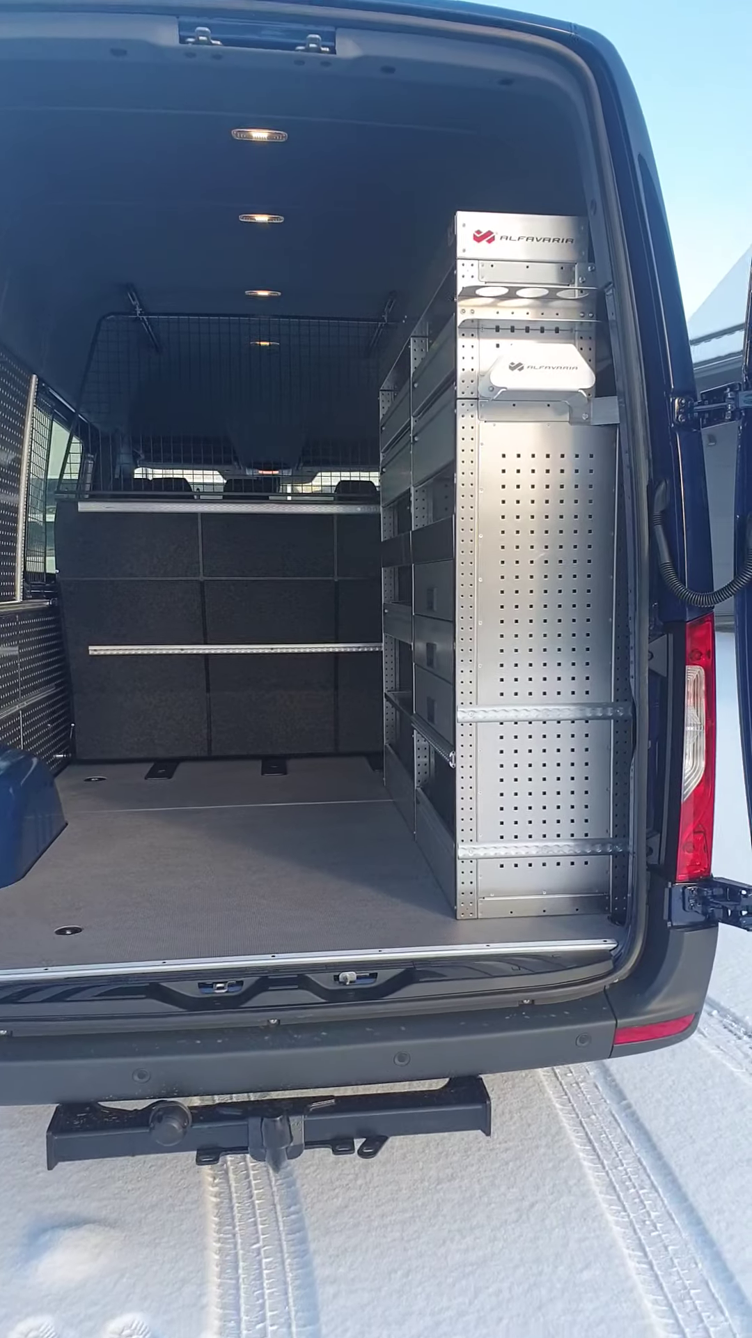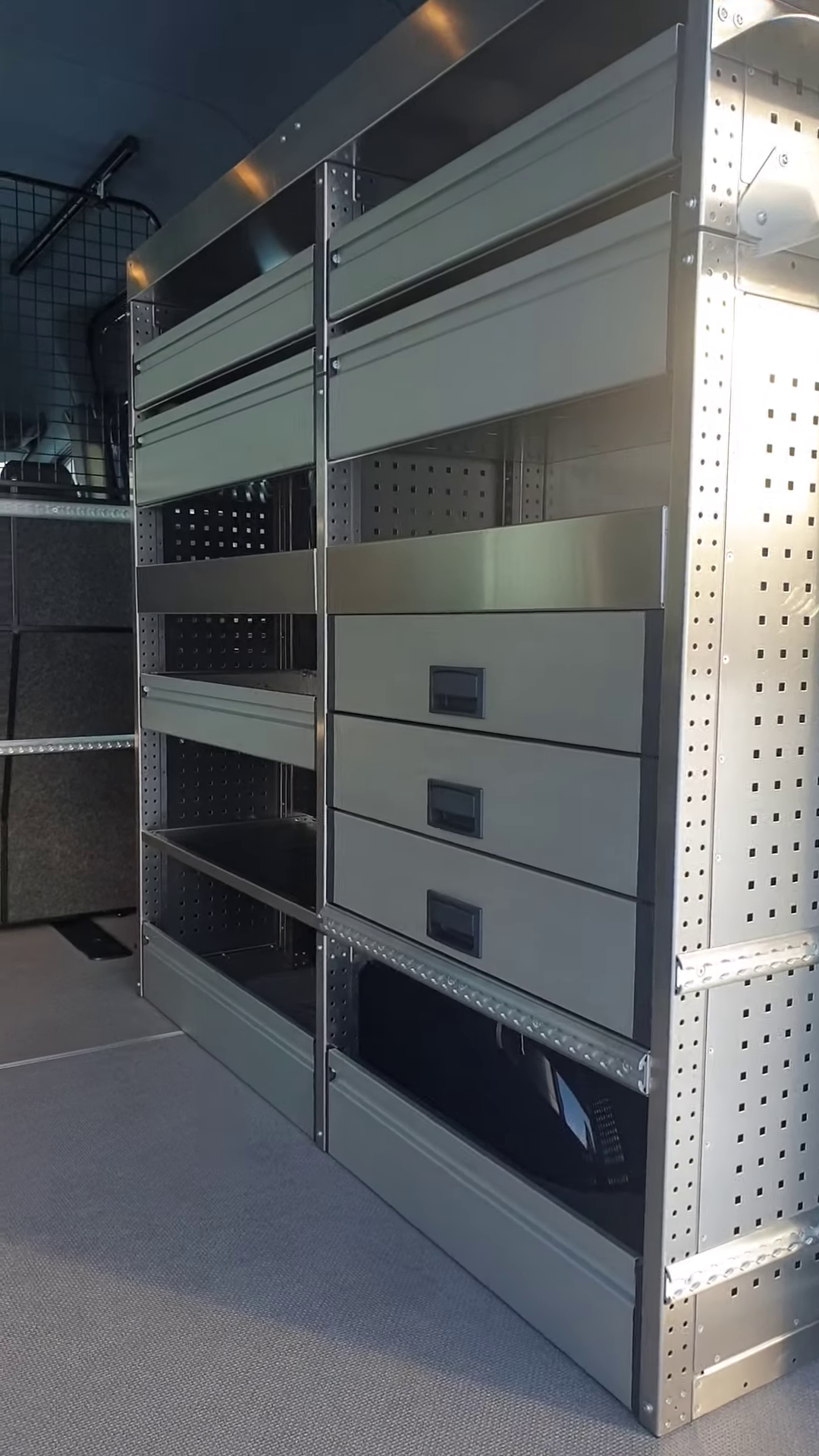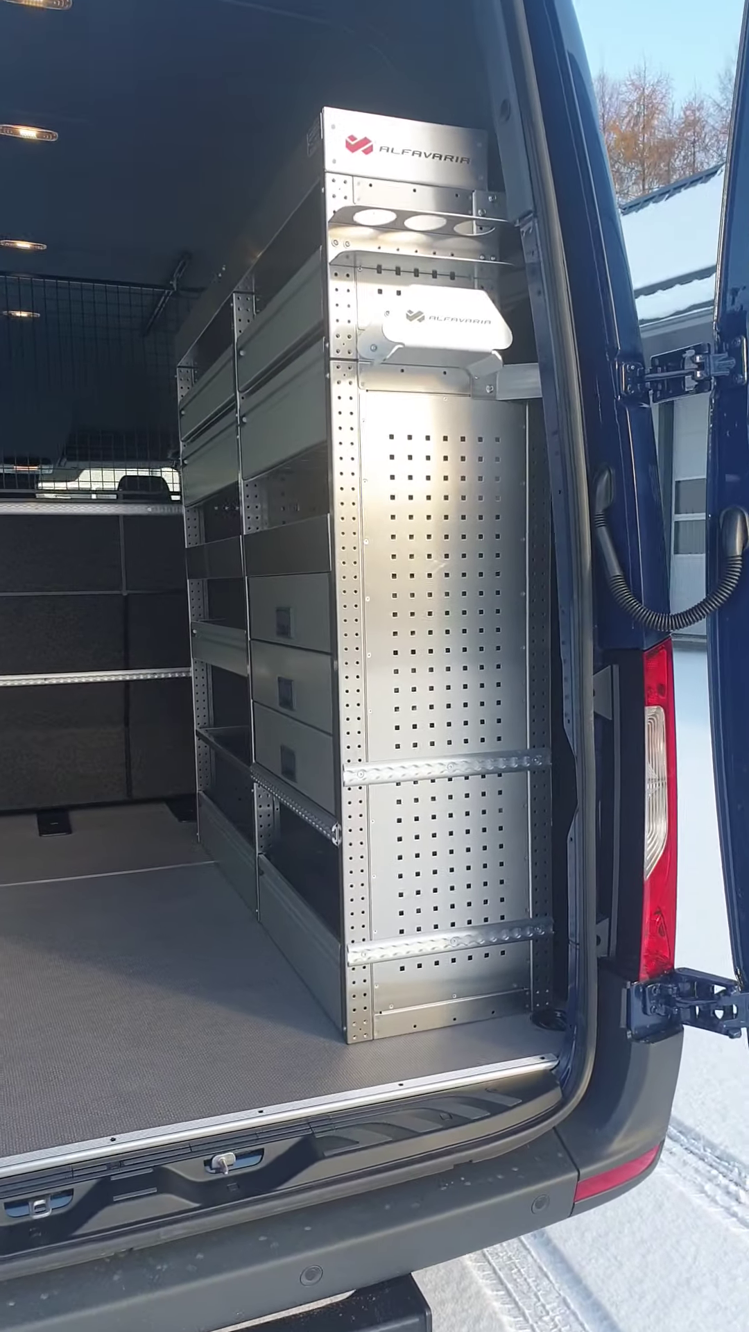 Při výrobě vestavby jsme kladli důraz na kvalitu a funkčnost. Na jedné straně vozidla byly instalovány pevné, avšak lehké regály z hliníku. Tyto regály byly navrženy tak, aby poskytovaly maximální úložný prostor pro nářadí a pracovní materiály.