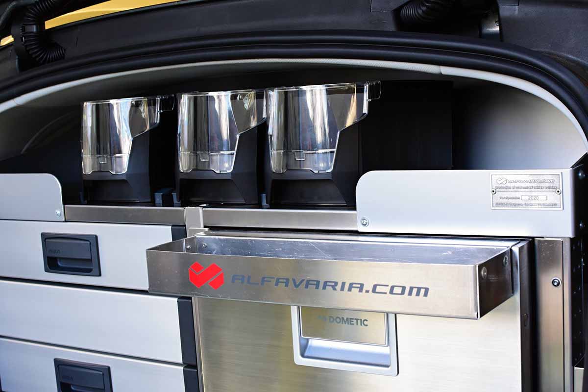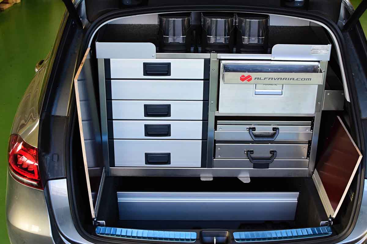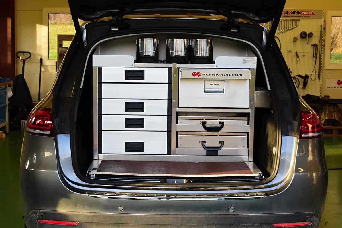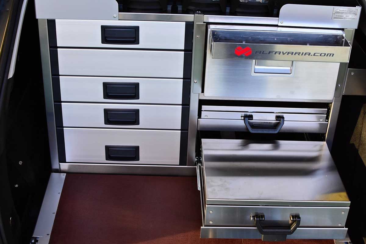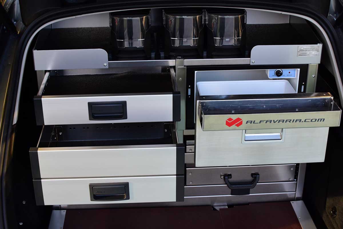 Krásná a praktická vestavba pro veterináře v terénu. Dvojitá výklopná podlaha, skříňky s bezpečnostními zásuvkami, vyjímatelné hliníkové kufry, chladicí zařízení na léky. Vestavbu do Mercedes Benz jsme navrhli tak, aby měl pan doktor při výjezdu veškerou výbavu po ruce, ergonomicky uspořádanou. Zavazadlový prostor jsme využili do posledního místa, do pravé části jsme zapojili ledničku na přípravky, které je potřeba uchovávat v chladu.