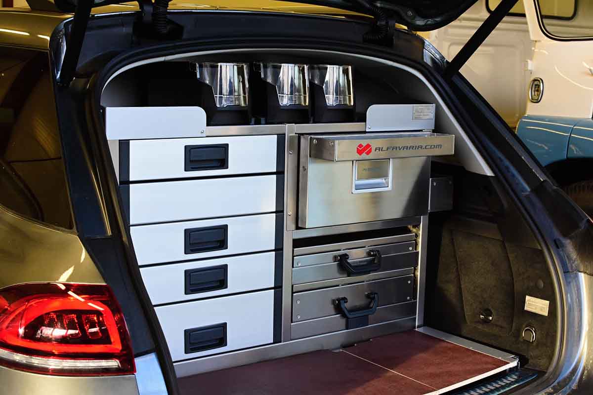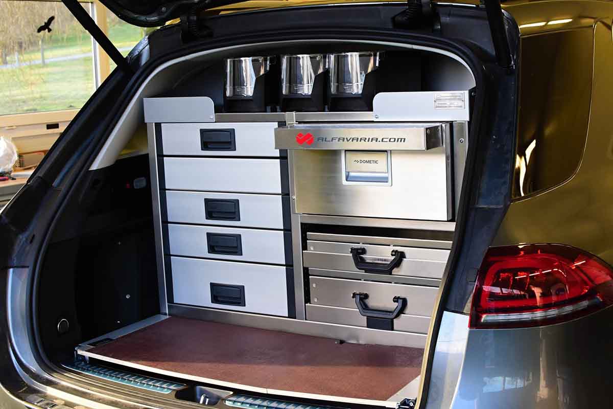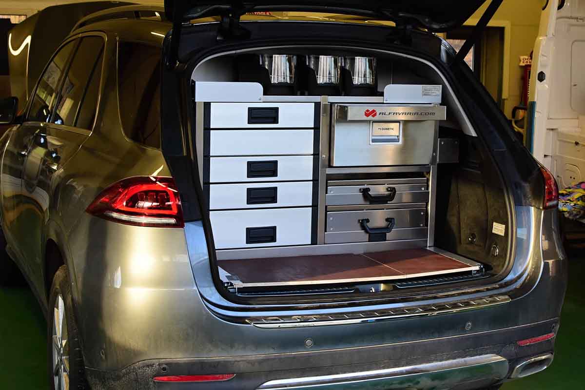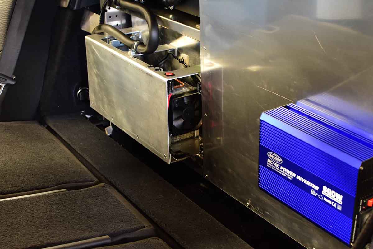 Zajímavostí u této vestavby je dvojitá výklopná podlaha se sklopnou přepážkou, kterou jsme vyráběli na zakázku. Ochranná přepážka bezpečně odděluje posádku vozidla od uložené výbavy. Vestavba obsahuje velké množství členěných úložných prostor, samozřejmě uvnitř auta nesmí nic klepat, proto jsme použili tlumicí materiály, aby byl i v pracovním módu zachován ráz luxusního SUV. Celá vestavba je vyrobená z hliníku, je proto velice lehká a odolná. Díky zvoleným materiálům, konstrukci a technickému řešení vestavba nevydává při jízdě žádné nežádoucí zvuky (nevrže, neskřípe).