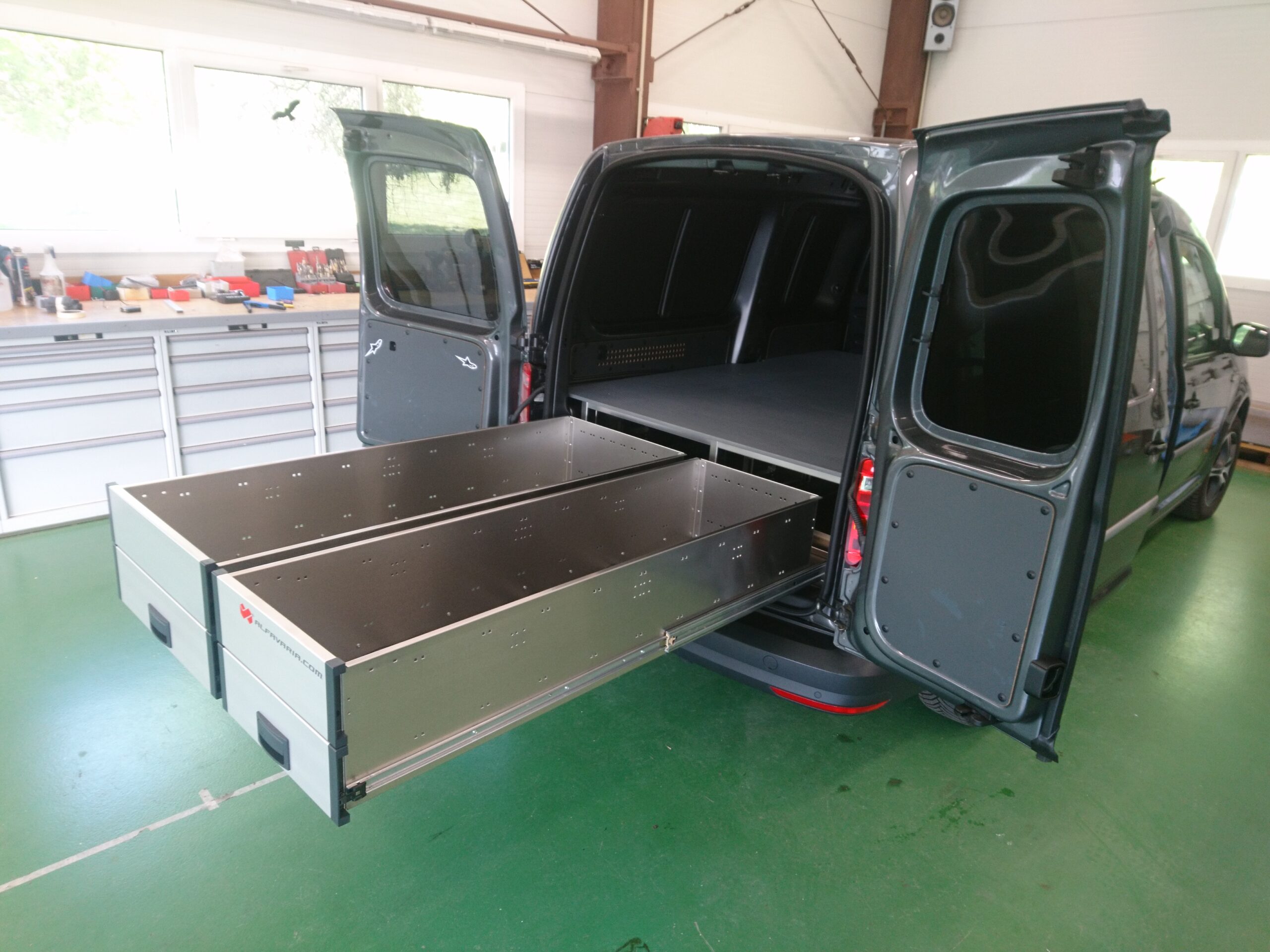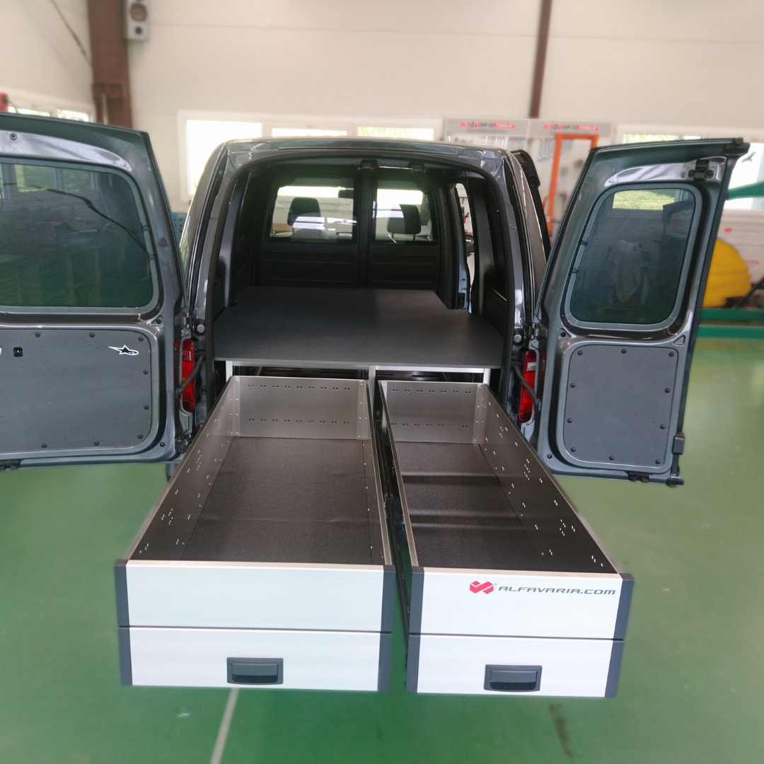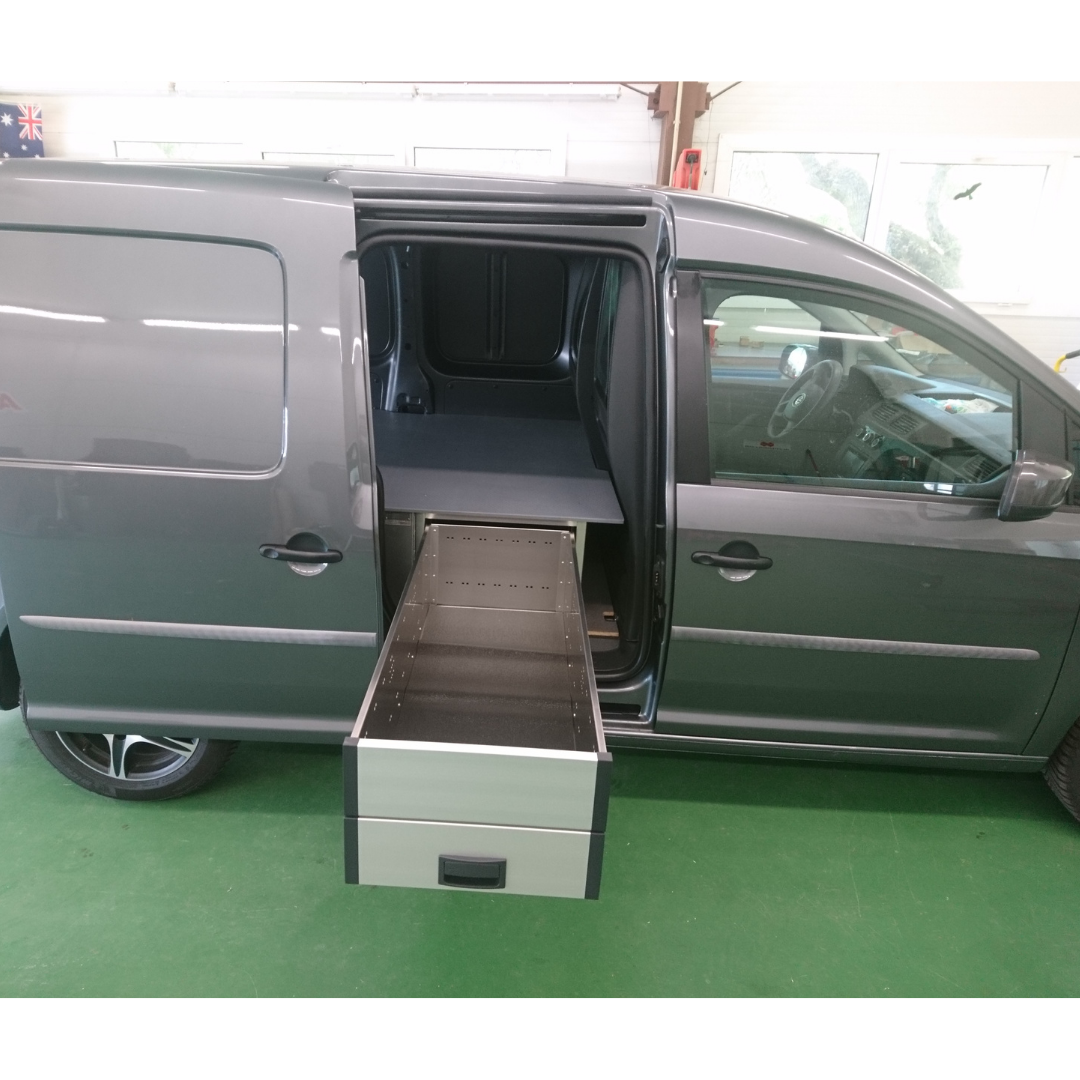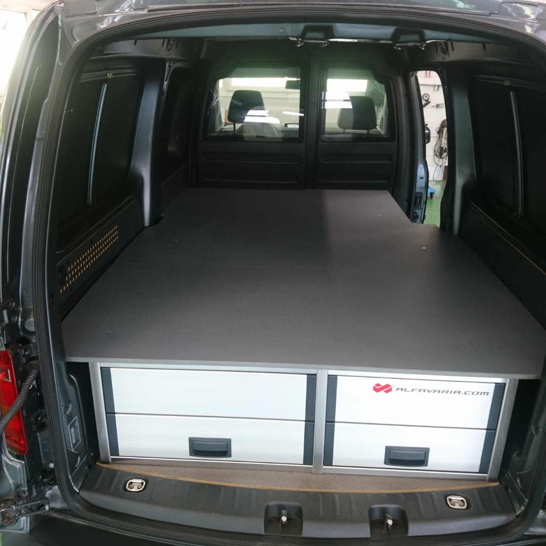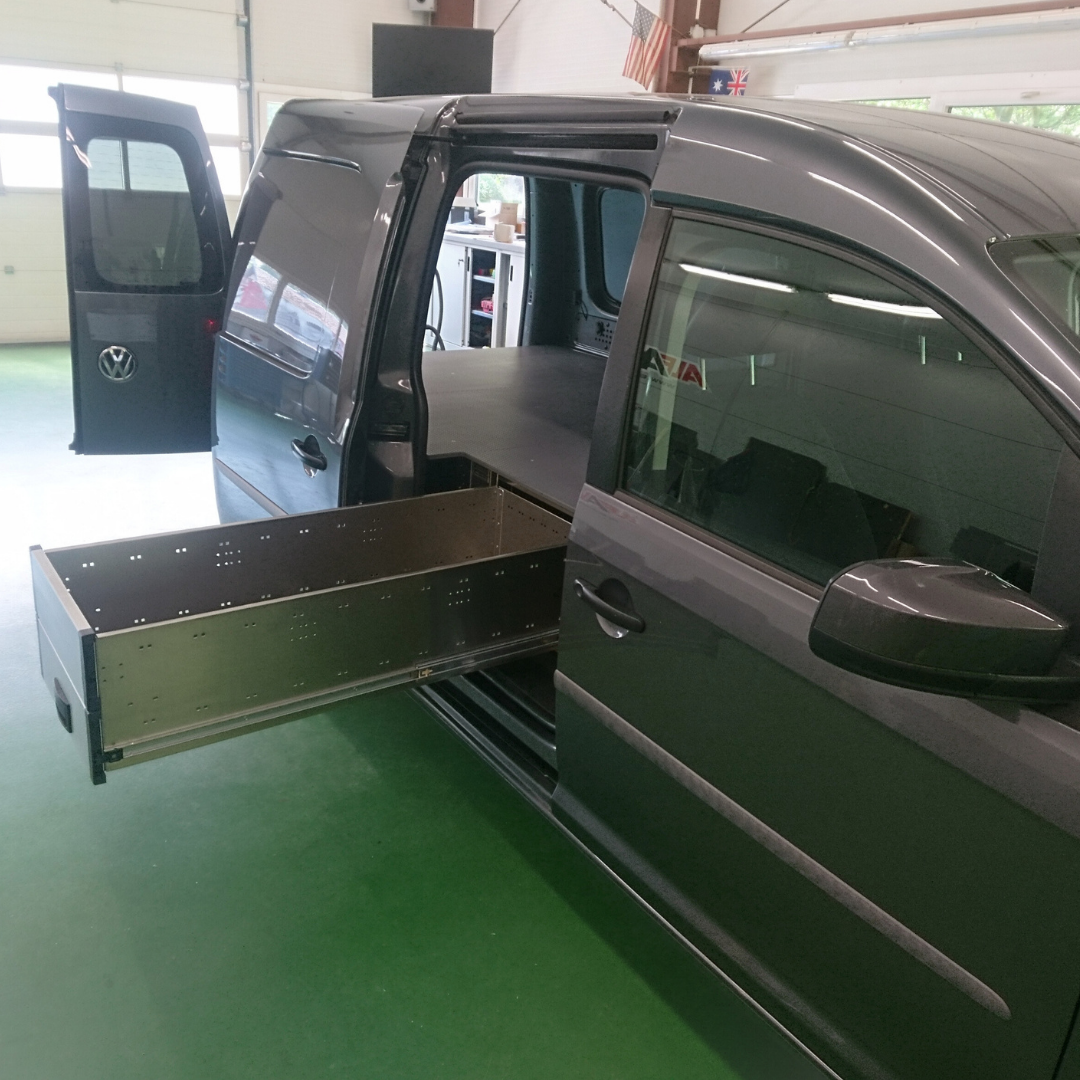 Na zakázku vyrobená auto vestavba do vozidla VW Caddy v dvoumístném provedení s přepážkou.