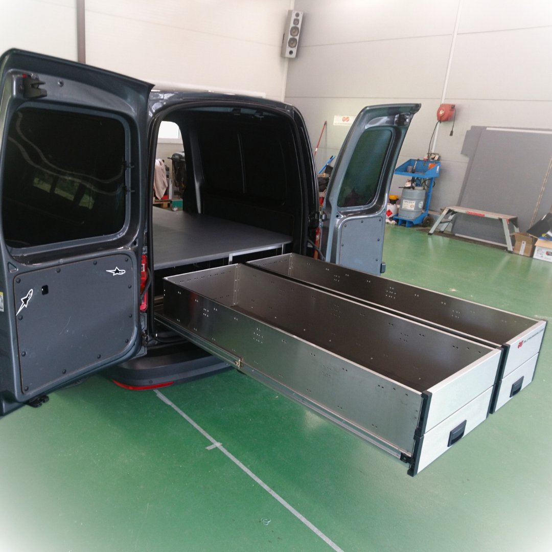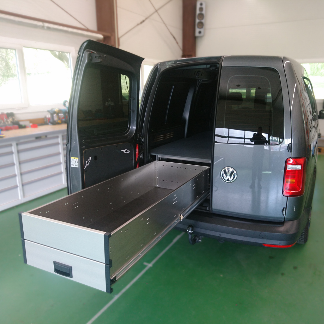 Auto vestavba tvoří základ pro víkendové kempingové vozidlo. Tři 100% výsuvy – dva v zadní části vozidla a jeden v prostoru pravých bočních dveří – poskytují dostatek úložného prostoru na běžné kempingové vybavení a nezbytné zásoby. Zatímco horní deska s nosností 700 kg (plošné zatížení) je připravená pro vložení pěnové matrace.