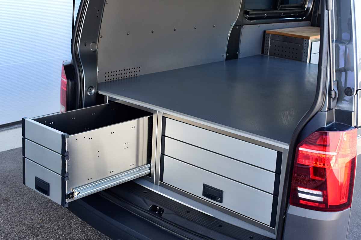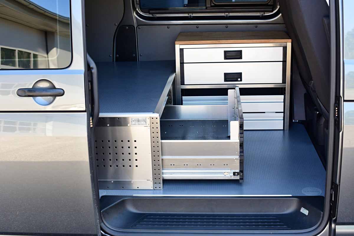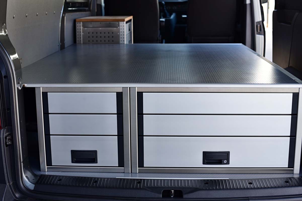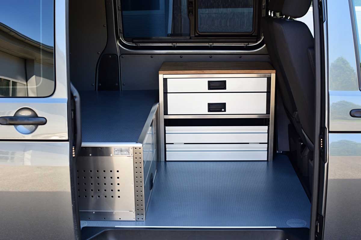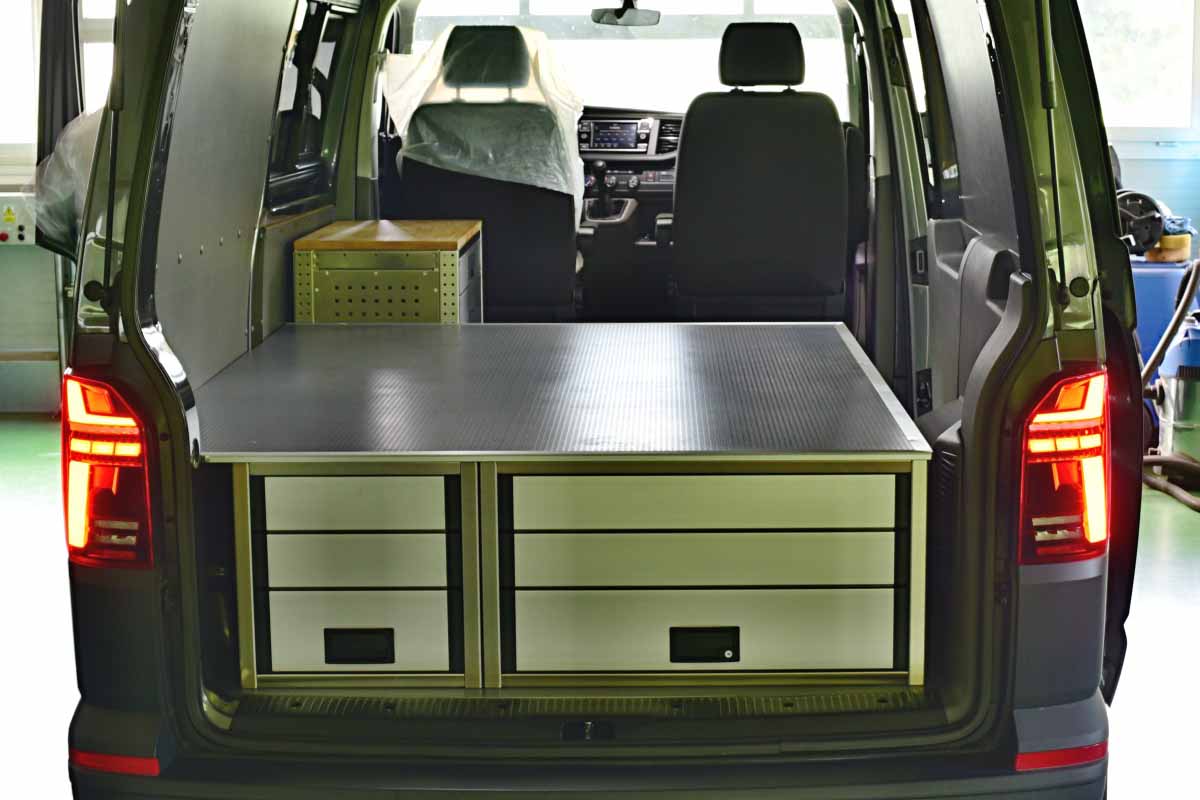 👉 Dominantním prvkem této vestavby je velká lůžková plocha, určená pro spaní v autě. Pod lůžkem se nacházejí dvě zásuvky s plným výsuvek, a poskytují tak velkorysý prostor pro uložení nezbytné výbavy, pracovního náčiní nebo kempového vybavení. Veškeré výsuvy jsou zabezpečené vůči samovolnému otevření, vestavba je vyrobená z hliníku, tudíž je velmi lehká, odolná, a působí reprezentativně.