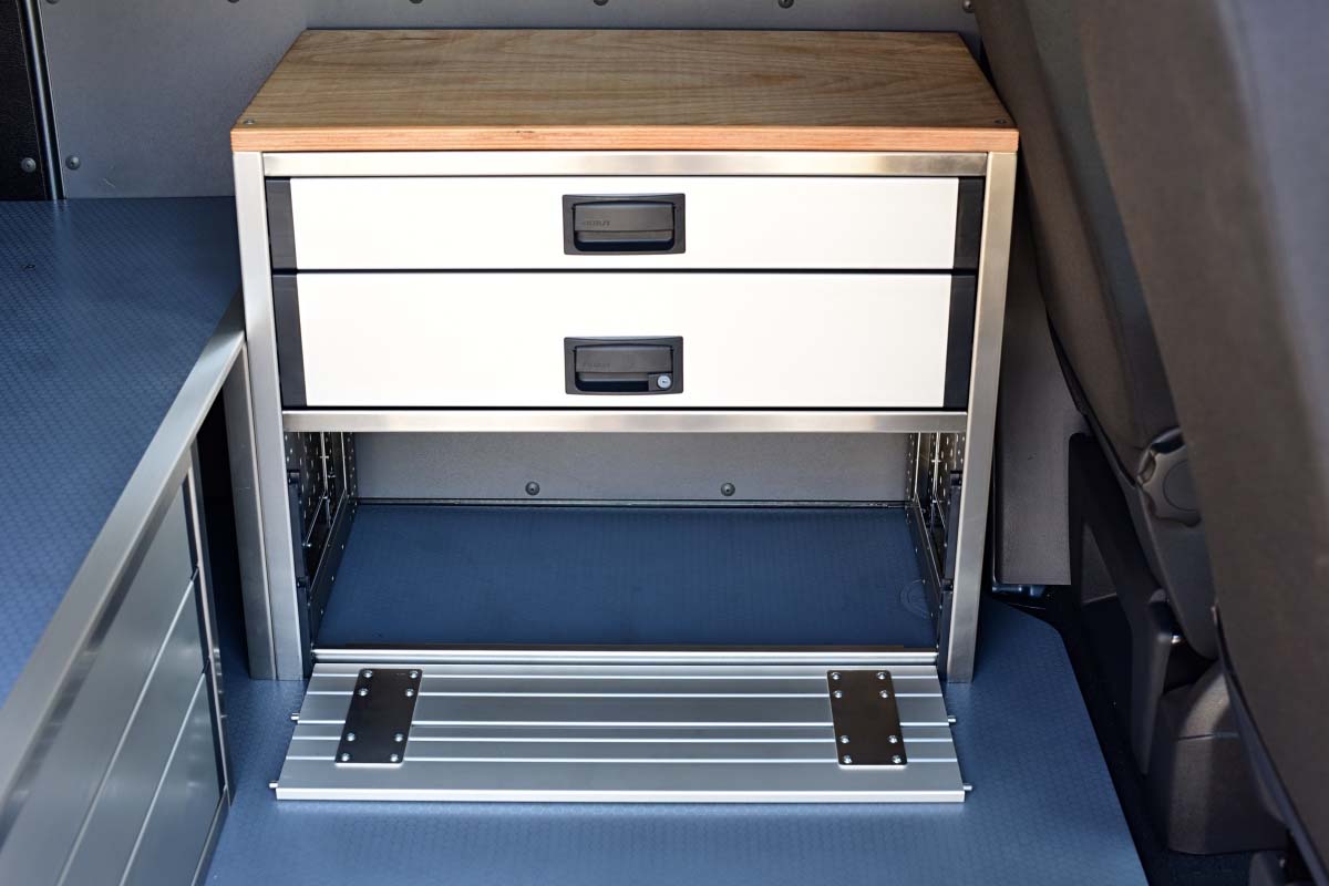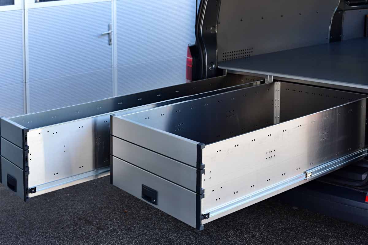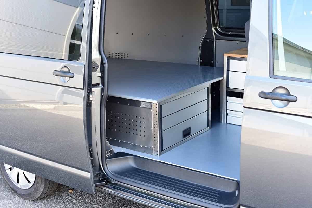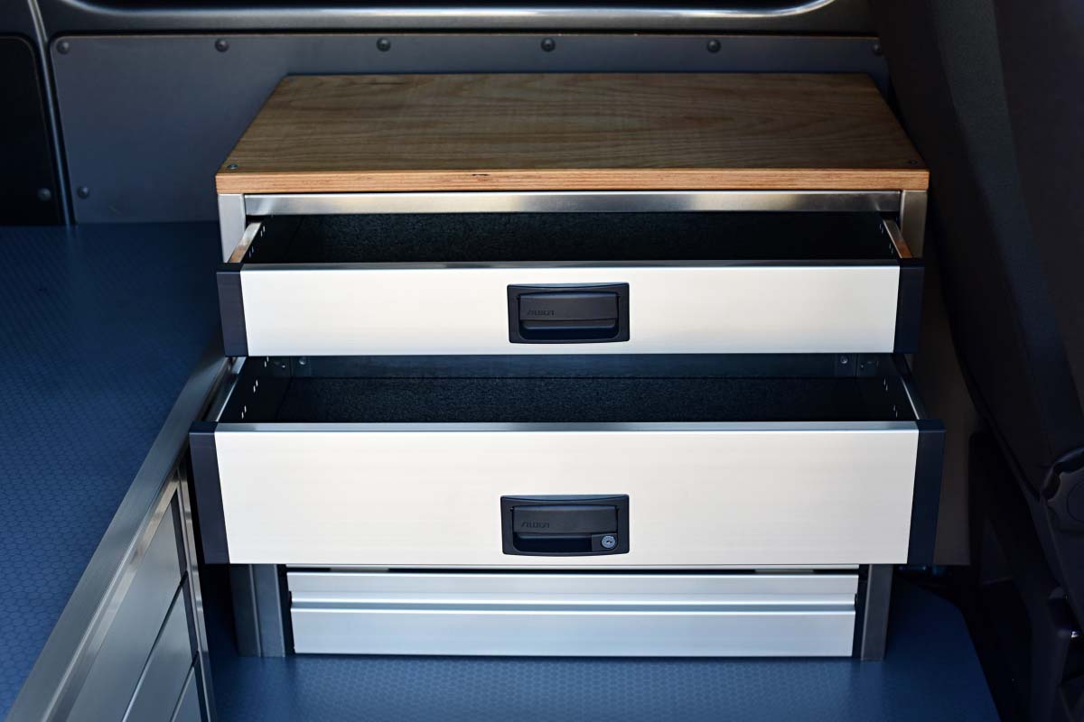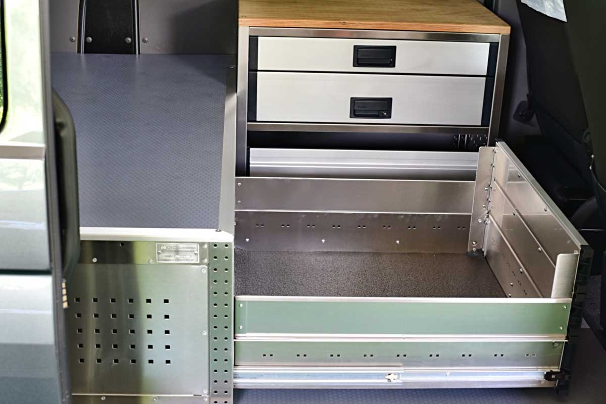 👉 Dominantním prvkem této vestavby je velká lůžková plocha, určená pro spaní v autě. Pod lůžkem se nacházejí dvě zásuvky s plným výsuvek, a poskytují tak velkorysý prostor pro uložení nezbytné výbavy, pracovního náčiní nebo kempového vybavení. Veškeré výsuvy jsou zabezpečené vůči samovolnému otevření, vestavba je vyrobená z hliníku, tudíž je velmi lehká, odolná, a působí reprezentativně.