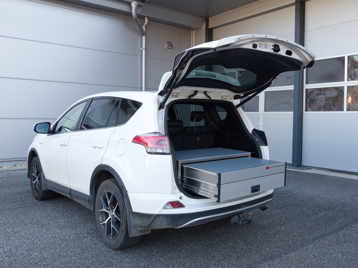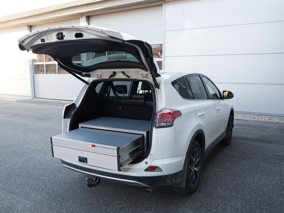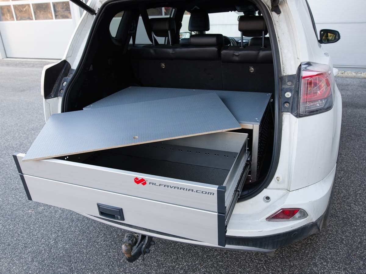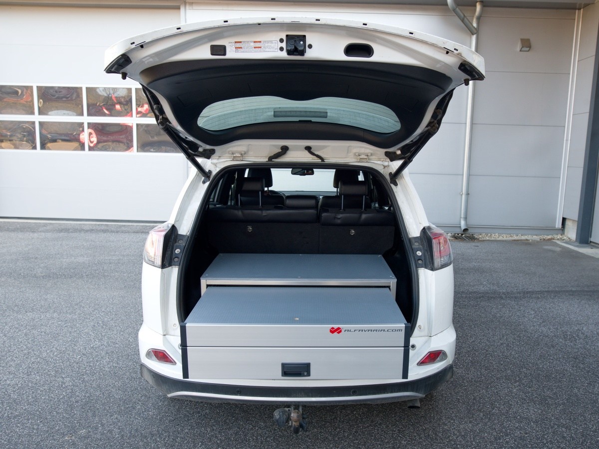 Vestavby vyrábíme i do malých typů vozů. Příkladem je jednoduchá auto vestavba do staršího modelu Toyota RAV4. Do kufru vozidla jsme instalovali jednoduchou skříňku s výsuvnou zásuvkou. Na přání zákazníka jsme zásuvku překryli jednoduše snímatelnou deskou, která zároveň slouží jako odkládací plocha. Vestavba slouží pro outdoor hobby aktivity, zákazník se zabývá zkoumáním kamenů ve volné přírodě.