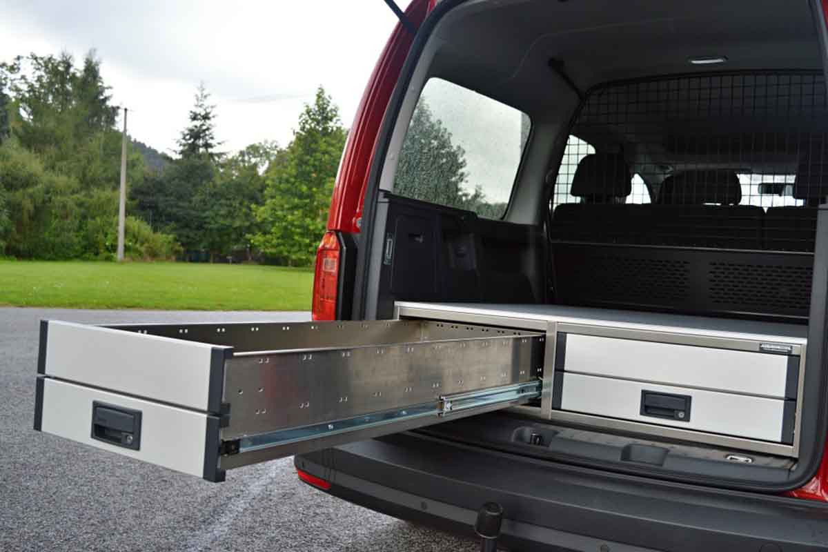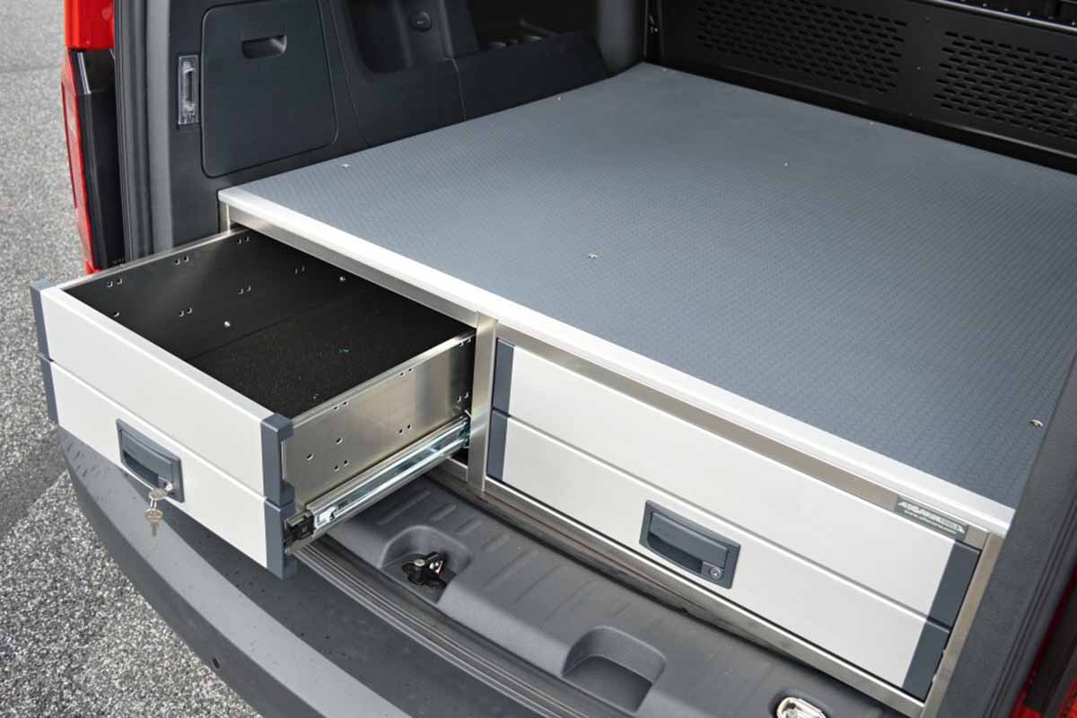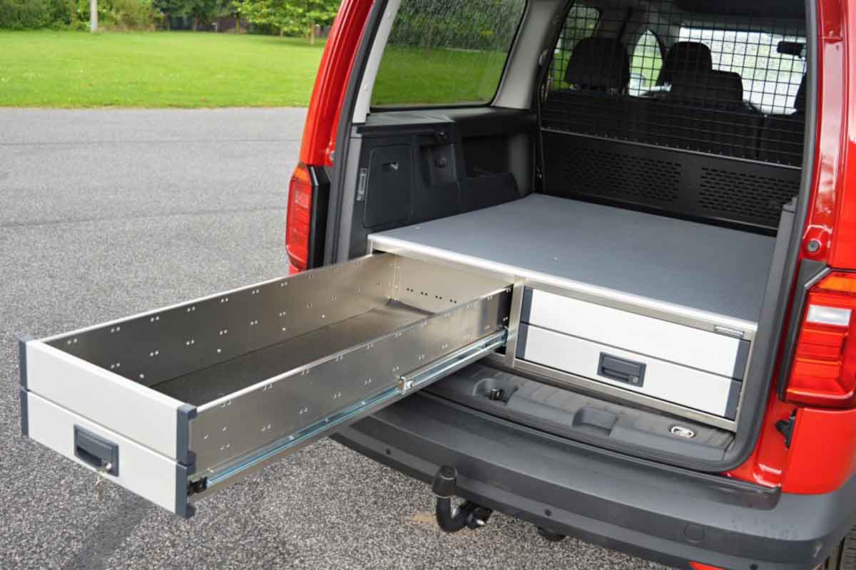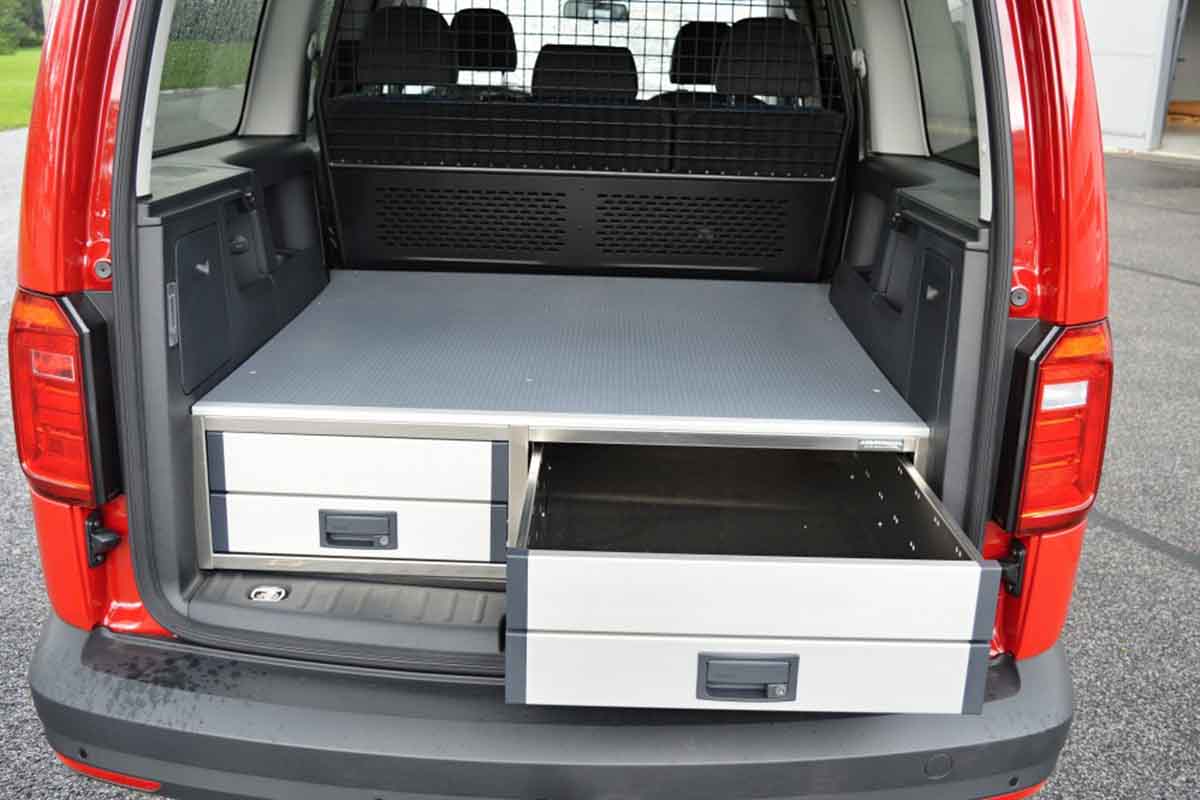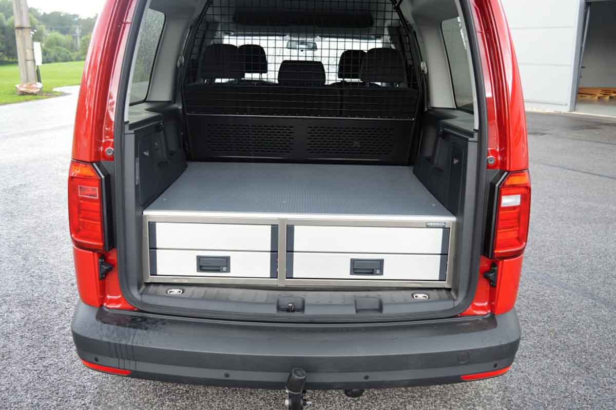 Jednoduchá vestavba do Volkswagen Caddy, zákazník si přál úložné prostory, které by neubraly na velikosti nákladového prostoru této malé, všestranné dodávky. Z požadavku vzešlo řešení v podobě zvýšené podlahy a dvou samostatně uzamykatelných zásuvek vyrobených z lehkého hliníku, se 100% výsuvem. Zásuvky jsou vyrobené z lehkého hliníku, uložené na kvalitních pojezdech. Při výsuvu zásuvek má zákazník uloženou výbavu ihned po ruce, odpadá hledání, přehrabování a natahování se pro díly, které jsou uložené v zadní části zásuvky, i díky plnému výsuvu. Horní plocha zvýšené podlahy v autě s protiskluzovou ochranou.