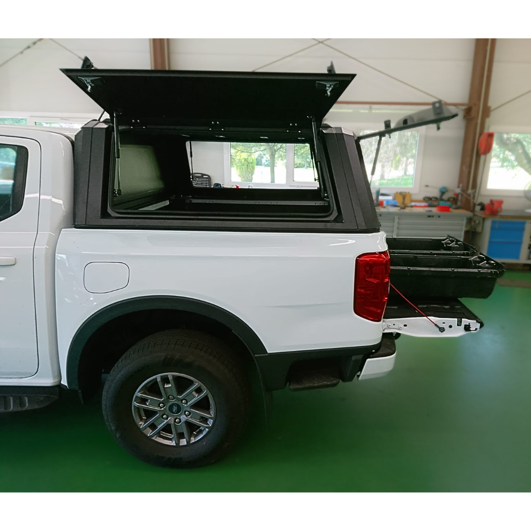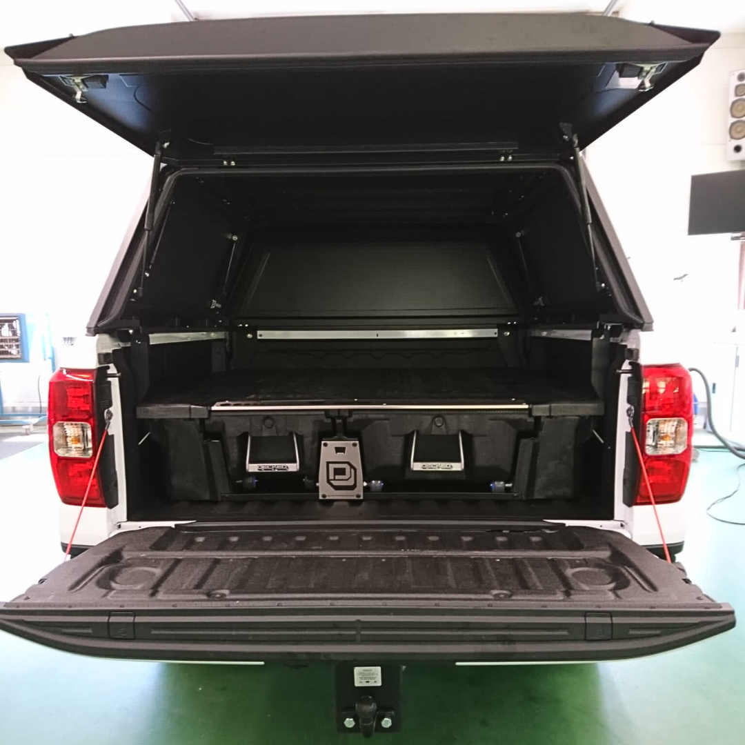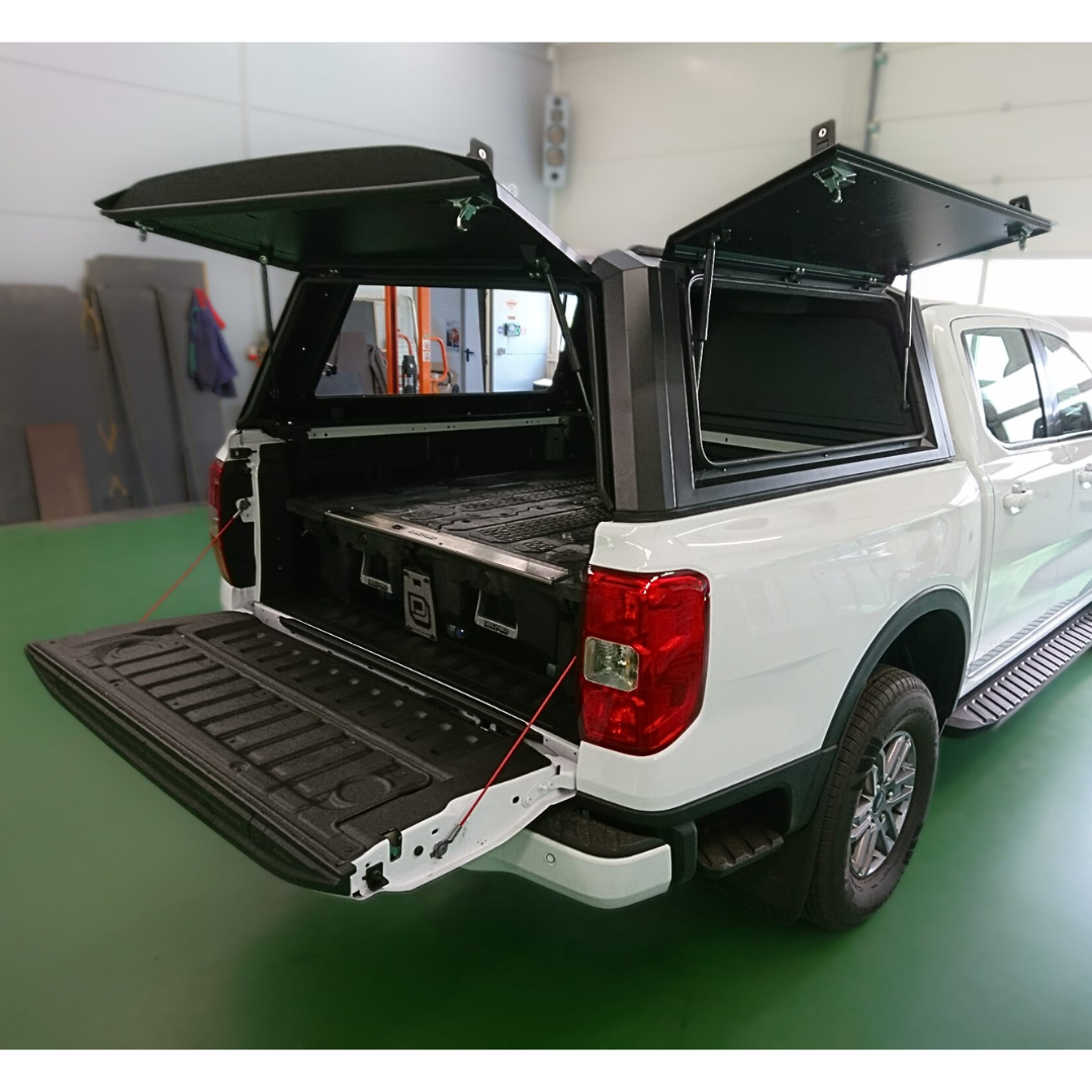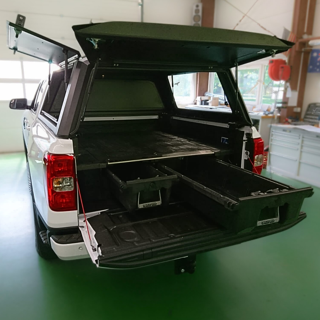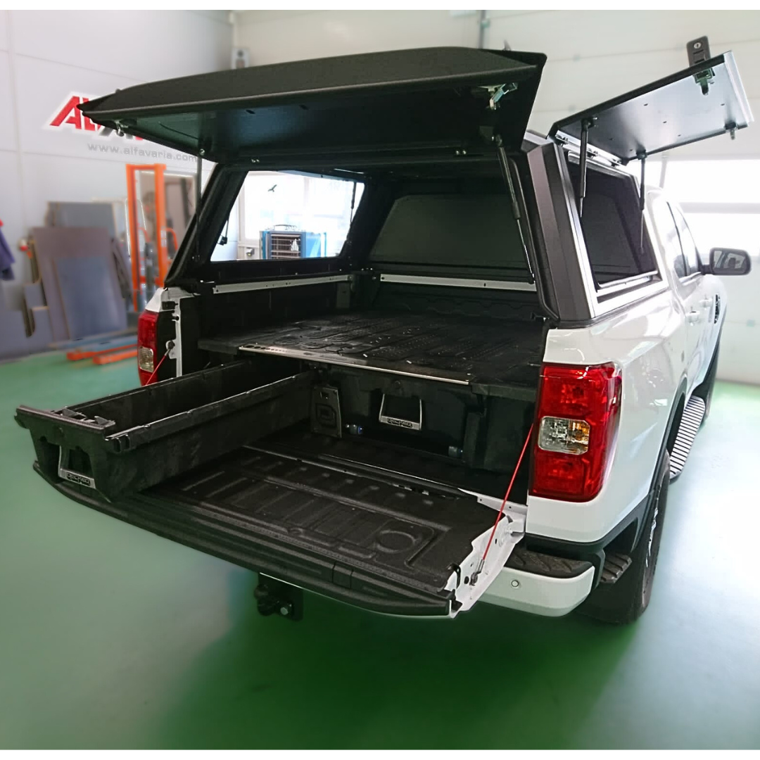 Výsuvné boxy lze montovat pod hardtop, ale i na korbu bez hardtopu. Jsou odolné, bytelné, připravené na práci nebo do přírody. Vaše nářadí, outdoorové vybavení, sportovní náčiní ochrání před vlivy počasí, déšť ani sníh se dovnitř boxů nedostane. Nosnost horní desky je 900 kg (plošné zatížení). Nosnost každého výsuvného boxu je 90 kg (plošné zatížení).